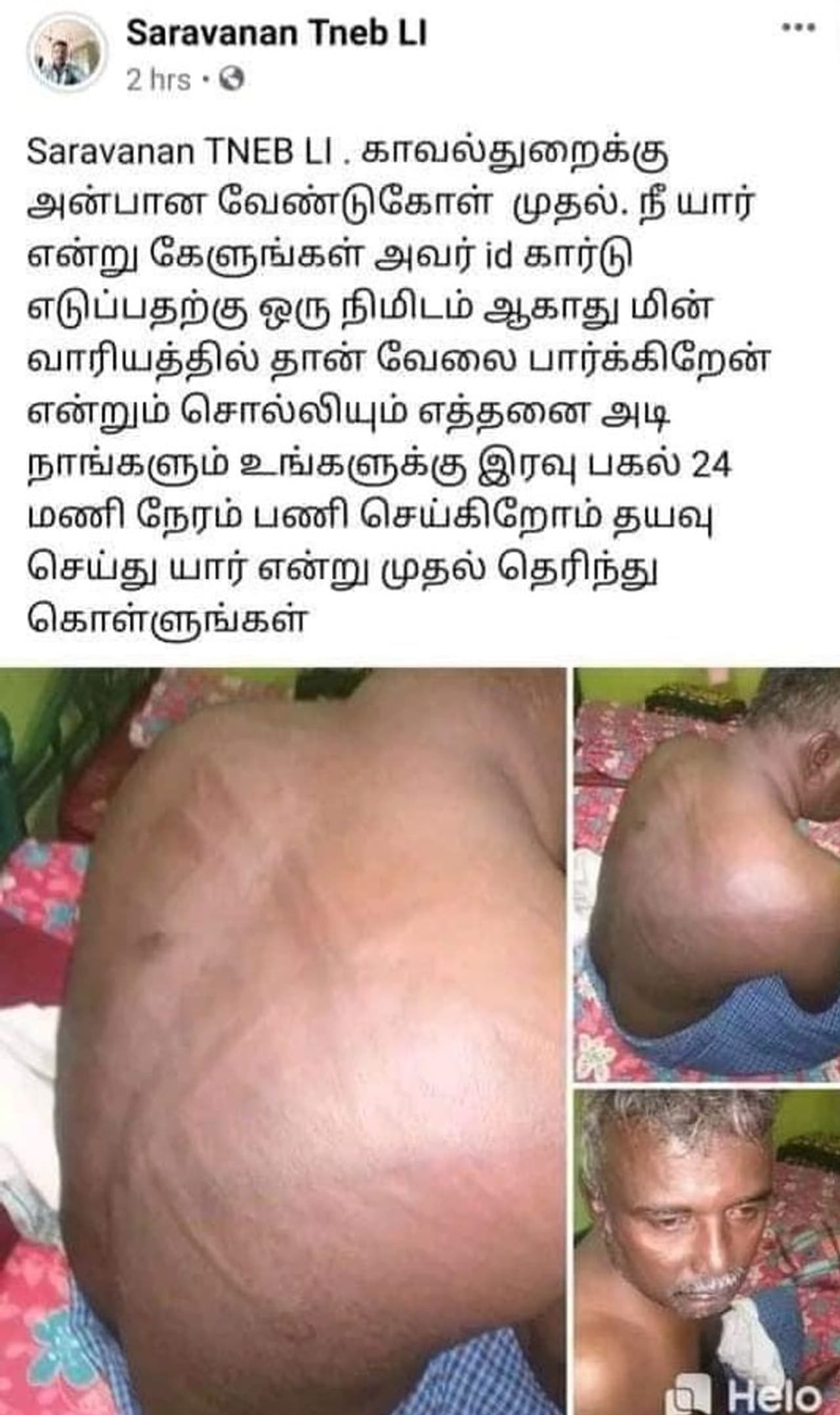 கடந்த செவ்வாய்க்கிழமை மாலையில் அலுவலகம் சென்ற அவர் சக ஊழியர்களிடம் தன்னை பாதுகாப்பு பணியில் இருந்த போலீசார் ஊரடங்கு உத்தரவை மீறி வெளியில் வந்ததாக கூறி அடித்து தாக்கியதாக கூறியிருக்கிறார். அது குறித்து மின்வாரிய ஊழியர்கள் விசாரித்தபோது மேட்டூர் அணையை ஒட்டி இருக்கும் சுரங்க மின் நிலையத்தில் வேலை முடித்துவிட்டு வீட்டிற்கு சென்று கொண்டிருந்தபோது இந்தியன் வங்கி முன்பு போலீசார் பாதுகாப்பு பணியில் ஈடுபட்ட இருந்ததாகவும் தனது வாகனத்தை நிறுத்தி விசாரித்தவர்கள் மின்வாரிய ஊழியர் என்று கூறியும் அதை நம்பாமல் தாக்கியதாகவும் லத்தியால் அடித்து உடம்பில் காயங்களை ஏற்படுத்தியதாக காட்டியிருக்கிறார். இதனால் அதிர்ச்சி அடைந்த ஊழியர்கள் அவர் கூறியதை நம்பி உடனடியாக மின் வாரிய தலைவர் மூலமாக காவல்துறையில் புகார் அளித்தனர். மேலும் பணிக்கு சென்ற மின்வாரிய ஊழியரை போலீசார் சரமாரியாக தாக்கியதாக சமூக வலைதளங்களில் புகைப்படங்களுடன் பதிவிடவும் செய்தனர்.