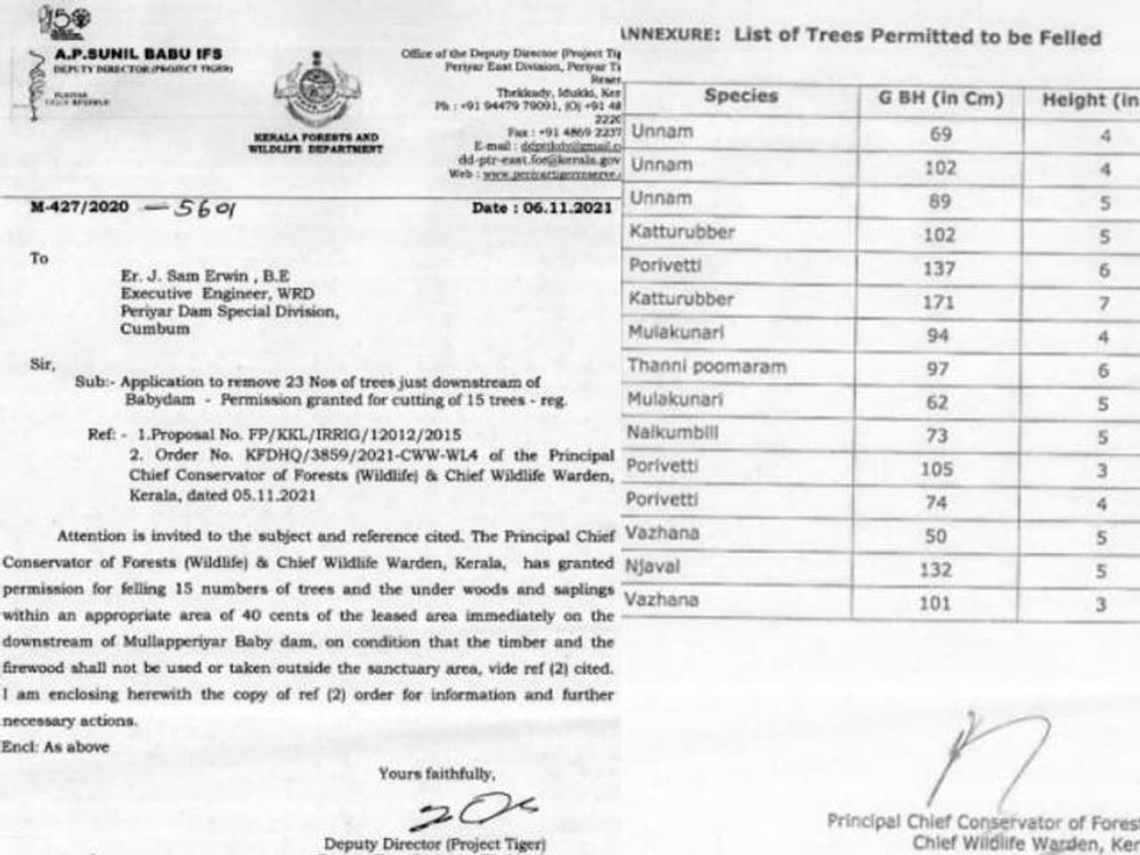 பேபி அணை மற்றும் மண் அணையை வலுப்படுத்த இந்த நீண்ட கால கோரிக்கை மிகவும் முக்கியமானது என்றும், இந்தக் கட்டமைப்புகளை வலுப்படுத்துவதற்கான நடவடிக்கைகளைத் தொடங்க இந்த அனுமதி தங்களுக்கு உதவும் என்றும் தனது கடிதத்தில் குறிப்பிட்டிருந்தார். அந்நிலையில் கேரள வனத்துறை அமைச்சர் சுசீந்திரன் பேபி அணைக்கு கீழே உள்ள மரங்களை வெட்டுவதற்கு அனுமதி ரத்து செய்யப்பட்டுள்ளது என்றும் தவறு செய்த அதிகாரிகள் மீது கடும் நடவடிக்கை எடுக்கப்படும் என்று தெரிவித்திருந்தார் இந்த சம்பவம் தமிழக மக்களிடத்தில் கடும் சர்ச்சையை ஏற்படுத்தியிருந்தது. கேரளாவின் பேபி அணையில் 15 மரங்களை வெட்டுவதற்கு கடந்த 6ஆம் தேதி வழங்கப்பட்ட அனுமதி கடிதத்தை தமிழக அரசு வெளியிட்டது குறிப்பிடத்தக்கது.