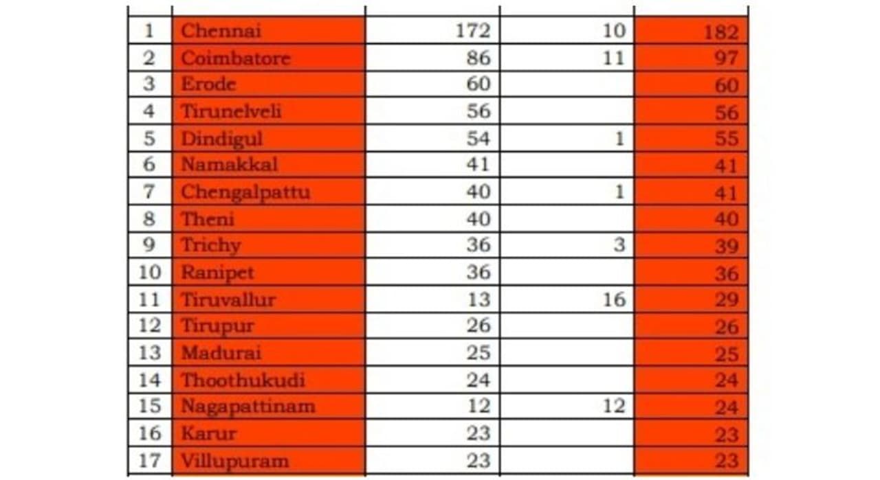 இதனிடையே தமிழகத்தில் கொரோனாவால் பாதிக்கப்பட்ட மாவட்டங்கள் பாதிப்பின் அளவுகளின் அடிப்படையில் மூன்றாக பிரிக்கப்பட்டிருக்கின்றன. மூன்று வண்ணங்கள் அடிப்படையில் பட்டியல் தயார் செய்யப்பட்டு முன்னெச்சரிக்கை நடவடிக்கைகள் தீவிரபடுத்தப்பட்டுள்ளது. நேற்று வெளியிடப்பட்ட மாவட்ட வாரியான கொரோனா பாதித்தவர்களின் பட்டியல் மூன்று வண்ணங்களாக பிரித்து வெளியிடப்பட்டிருந்தது. அதன்படி பாதிப்பு அதிகமிருக்கும் 17 மாவட்டங்கள் சிவப்பு வண்ணத்தில் குறிக்கப்பட்டிருக்கிறது. இந்த மாவட்டங்கள் அனைத்திலும் கொரோனா பாதிப்படைந்தவர்கள் எண்ணிக்கை 20க்கு மேல் இருக்கிறது. சென்னை, கோவை, ஈரோடு, நெல்லை, திண்டுக்கல், நாமக்கல், செங்கல்பட்டு, தேனி, திருச்சி, ராணிபேட்டை, திருவள்ளூர், திருப்பூர், மதுரை, தூத்துக்குடி, நாகை, கரூர், விழுப்புரம் ஆகிய 17 மாவட்டங்கள் சிவப்பு வண்ணத்தில் குறிக்கப்பட்டிருக்கிறது.