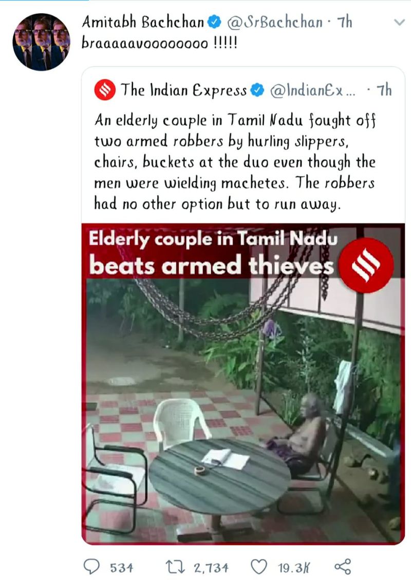 கொள்ளையர்களை விரட்டியடித்த வயதான தம்பதிகளை பாலிவுட் சூப்பர் ஸ்டார் அமிதாப் பச்சன் ட்விட்டரில் பாராட்டியுள்ளார் .