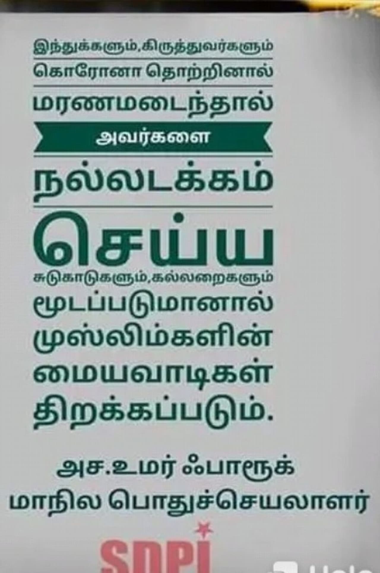 இந்த நிலையில் கொரோனா நோயால் பாதிக்கப்பட்டு மரணம் அடைந்தவர்களை முஸ்லிம்களின் மையவாடியில் அடக்கம் செய்யலாம் என எஸ்டிபிஐ கட்சியின் மாநில பொதுச்செயலாளர் அச. உமர்பாரூக் தெரிவித்திருக்கிறார். கொரோனா தொற்று ஏற்பட்டு பலியாகும் இந்துக்களுக்கும் கிறிஸ்தவர்களுக்கும் சுடுகாட்டிலும் கல்லறையிலும் அடக்கம் செய்ய எதிர்ப்பு நிலவி மயானங்கள் மூடப்படும் பட்சத்தில் முஸ்லிம்களின் மையவாடிகள் திறக்கப்படும் என கூறியிருக்கிறார். இது பல்வேறு தரப்பிலும் வரவேற்பை பெற்றுள்ளது. அக்கட்சியின் நெல்லை மாவட்ட சமூக வலைதளம் ஒன்றின் பக்கத்தில் வெளியாகி இருக்கும் இச்செய்தி தற்போது வைரலாக பரவி வருகிறது.