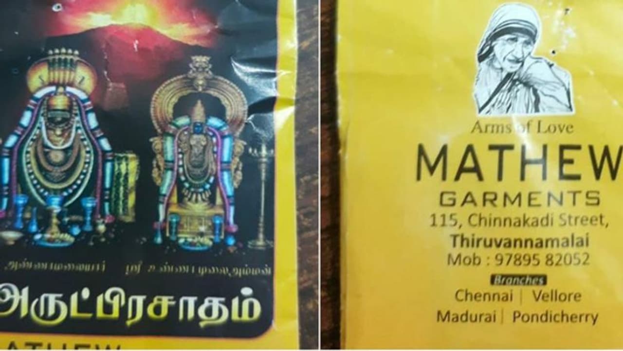 பஞ்சபூத தலங்களில் அக்னி திருத்தலமான திருவண்ணாமலை அண்ணாமலையார் கோயிலில் அன்னை தெரசா புகைப்படம் அச்சிடப்பட்ட கவரில் விபூதி, குங்குமம் வழங்கப்பட்டது இது பெரும் சர்ச்சையானது.