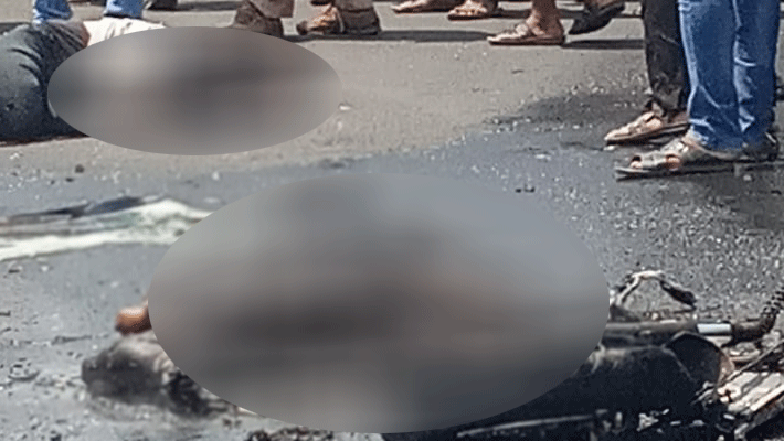 அப்போது எதிர்பாராதவிதமாக இருசக்கர வாகனத்தின் பெட்ரோல் டேங்க் திறந்துகொண்டதில், பெட்ரோல் கீழே கசிந்து தீப்பிடித்தது. இதில் இருசக்கர வாகனத்தில் வந்த இரண்டு இளைஞர்கள் சம்பவ இடத்திலேயே உடல் கருகி உயிரிழந்தனர். இது தொடர்பாக போலீசாருக்கும், தீயணைப்புத்துறைக்கு உடனே தகவல் தெரிவிக்கப்பட்டது.