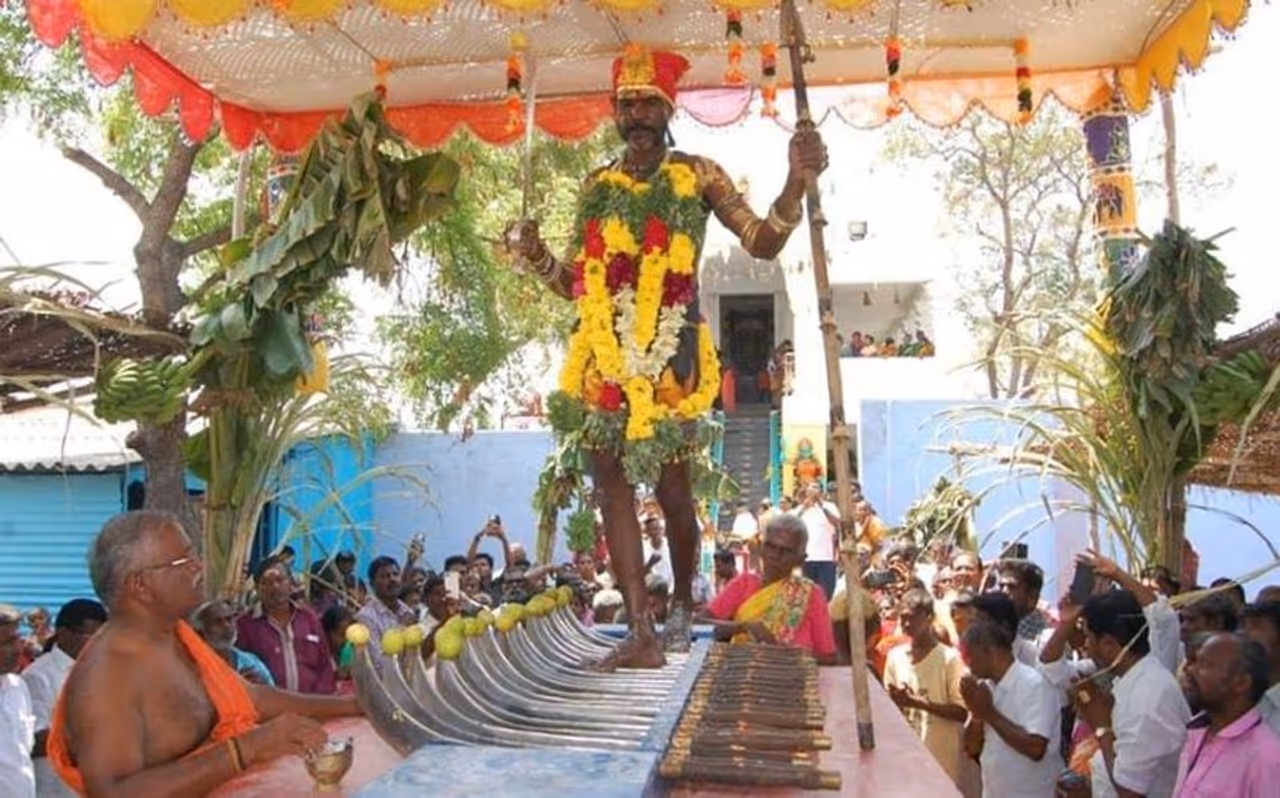 பின் சாமியார் அருள்வாக்கு சொல்லும் நிகழ்வு நடந்தது. இதற்காக அங்கு வைக்கப்பட்டிருந்த 21 அரிவாள்கள் மீது ஏறிநின்று குறி கூறினார். அதைத்தொடர்ந்து அருள்வாக்கு கூறிய சாமியாருக்கு மிளகாய் அபிஷேகம் நடைபெற்றது. 68 கிலோ மிளகாய் தூள் கரைத்து சாமியார் மீது ஊற்றப்பட்ட பிறகு அன்னதானம் வழங்கப்பட்டது. அதில் ஏராளமான பக்தர்கள் கலந்து கொண்டனர்.