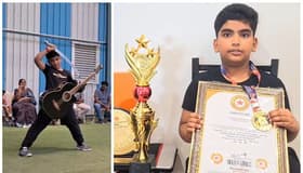 எட்டு வயது சிறுவன் தொடர்ந்து ஒரு மணி நேரம் ஒரு கையில் கிட்டார் வாசித்தும், ஒரு கையில் வாள் சுற்றியும் உலக சாதனை படைத்துள்ளான். சிறுவனின் சாதனையை பலரும் பாராட்டி வருகின்றனர்.