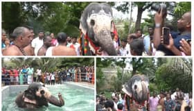திருவானைக்காவல் கோவிலின் செல்லப்பிள்ளையாக வளம் வரும் கோவில் யானை அகிலாவின் 22வது பிறந்தநாளை பக்தர்கள் கொண்டாடிய நிலையில், யானை அவர்களுக்கு தும்பிக்கையை உயர்த்தி நன்றி தெரிவித்தது.