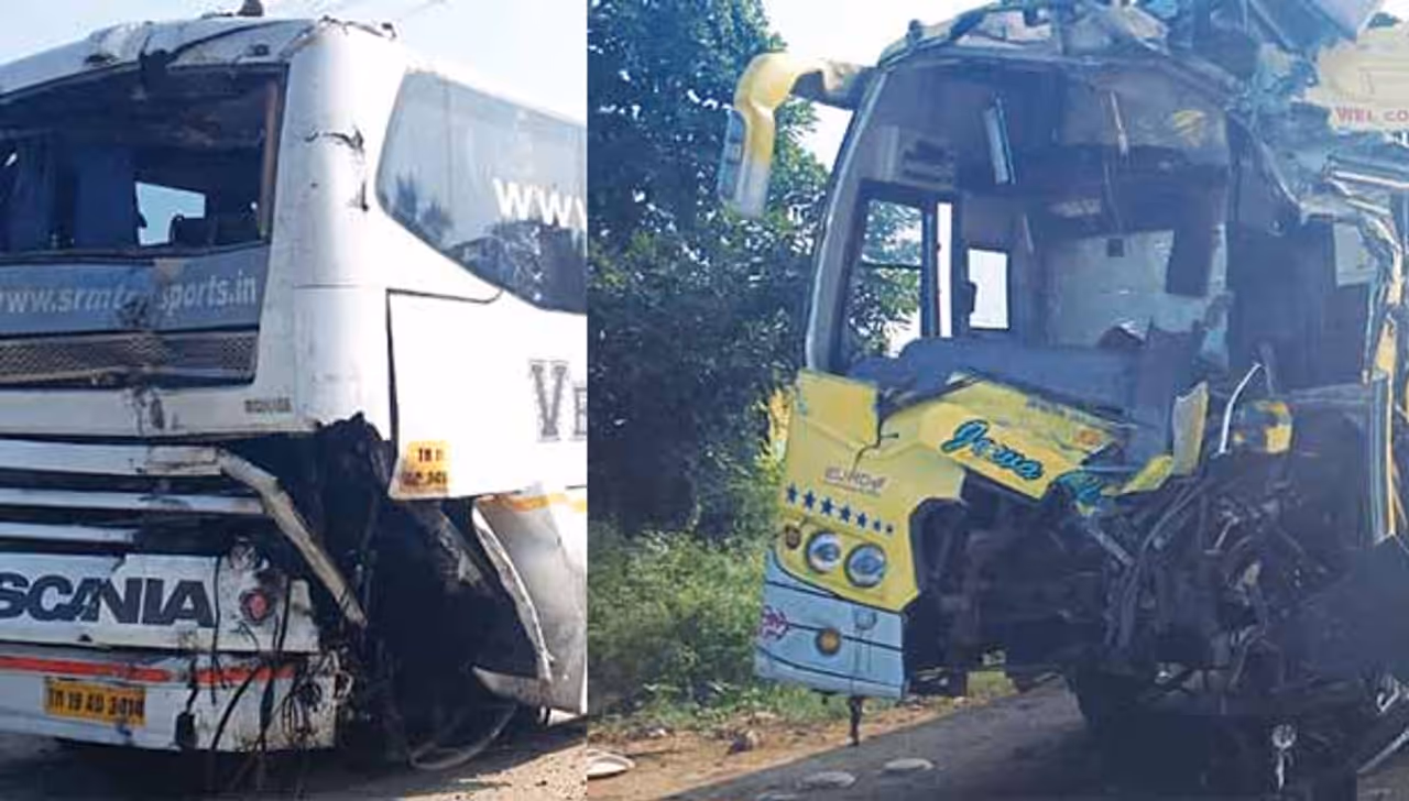 இரண்டு ஆம்னி பேருந்துகள் ஒன்றோடு ஒன்று மோதிக்கொண்ட விபத்தில் 15 பயணிகள் காயமடைந்துள்ளனர்.