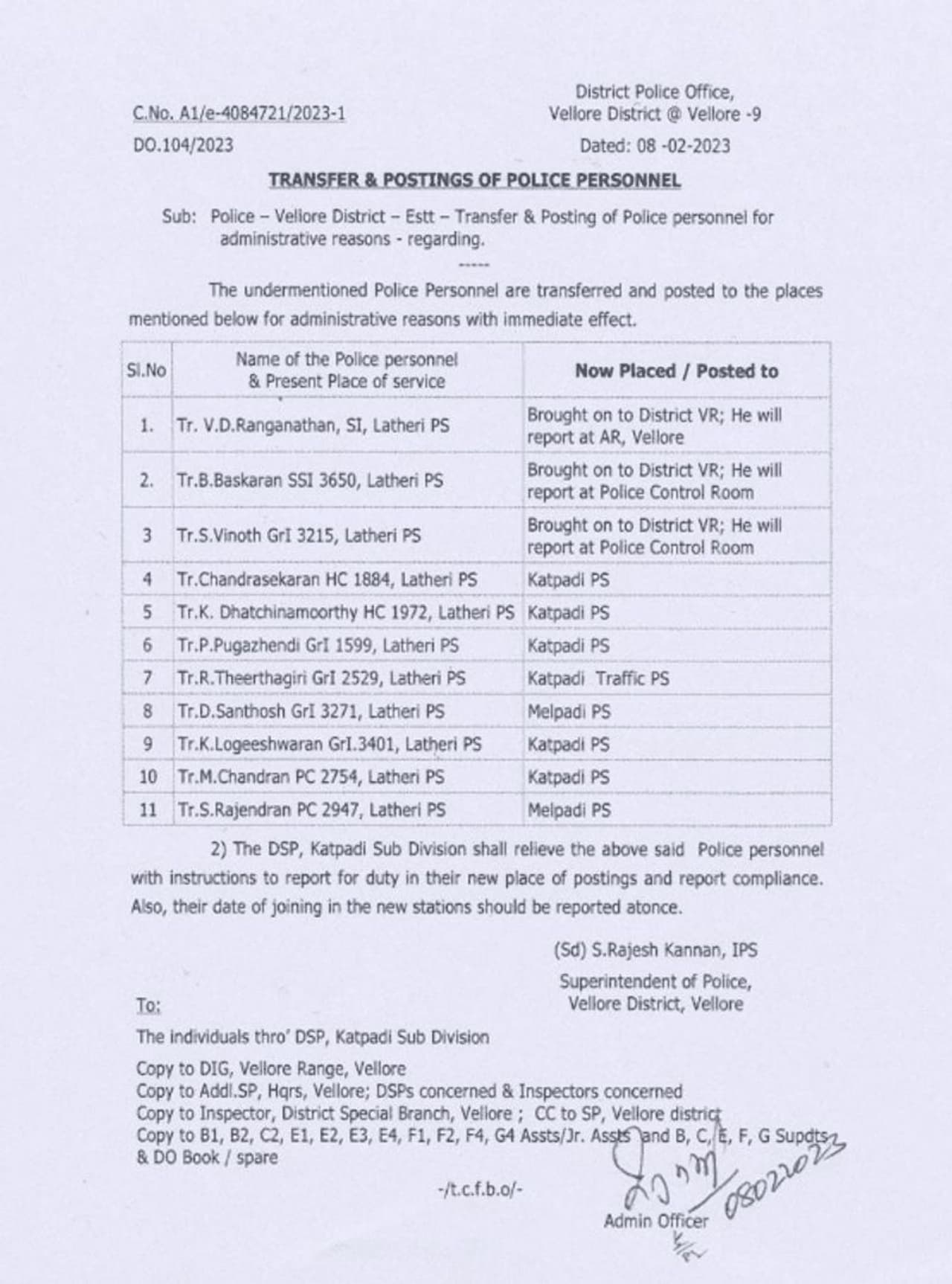 வேலூரில் 11 போலீசாரை கூண்டோடு மாற்றம் செய்து மாவட்ட காவல் கண்காணிப்பாளர் ராஜேஷ் கண்ணன் அதிரடி நடவடிக்கை மேற்கொண்டுள்ளார்.