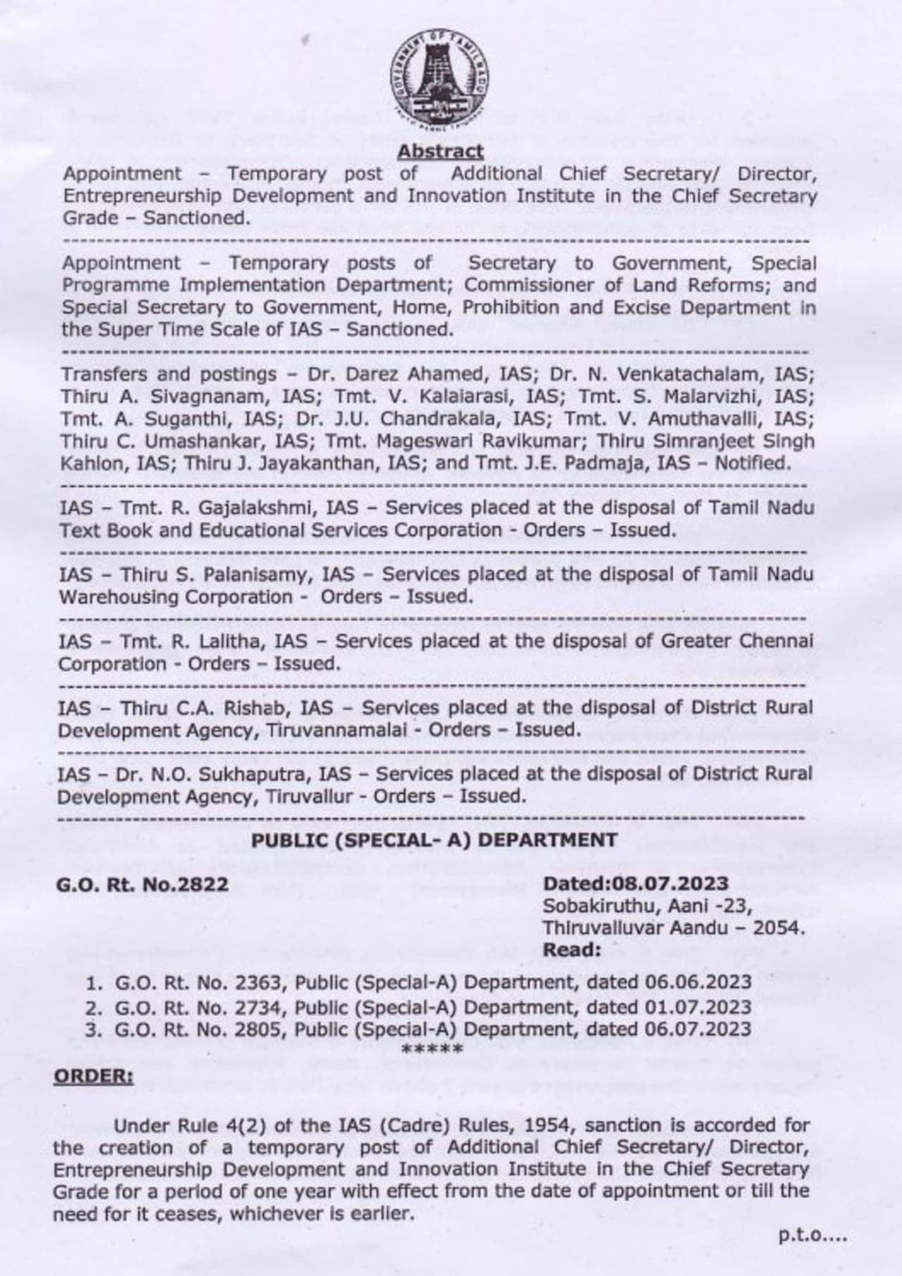 2.நில சீர்திருத்தத் துறை ஆணையராக வெங்கடாச்சலம் ஐ.ஏ.எஸ் நியமனம்;