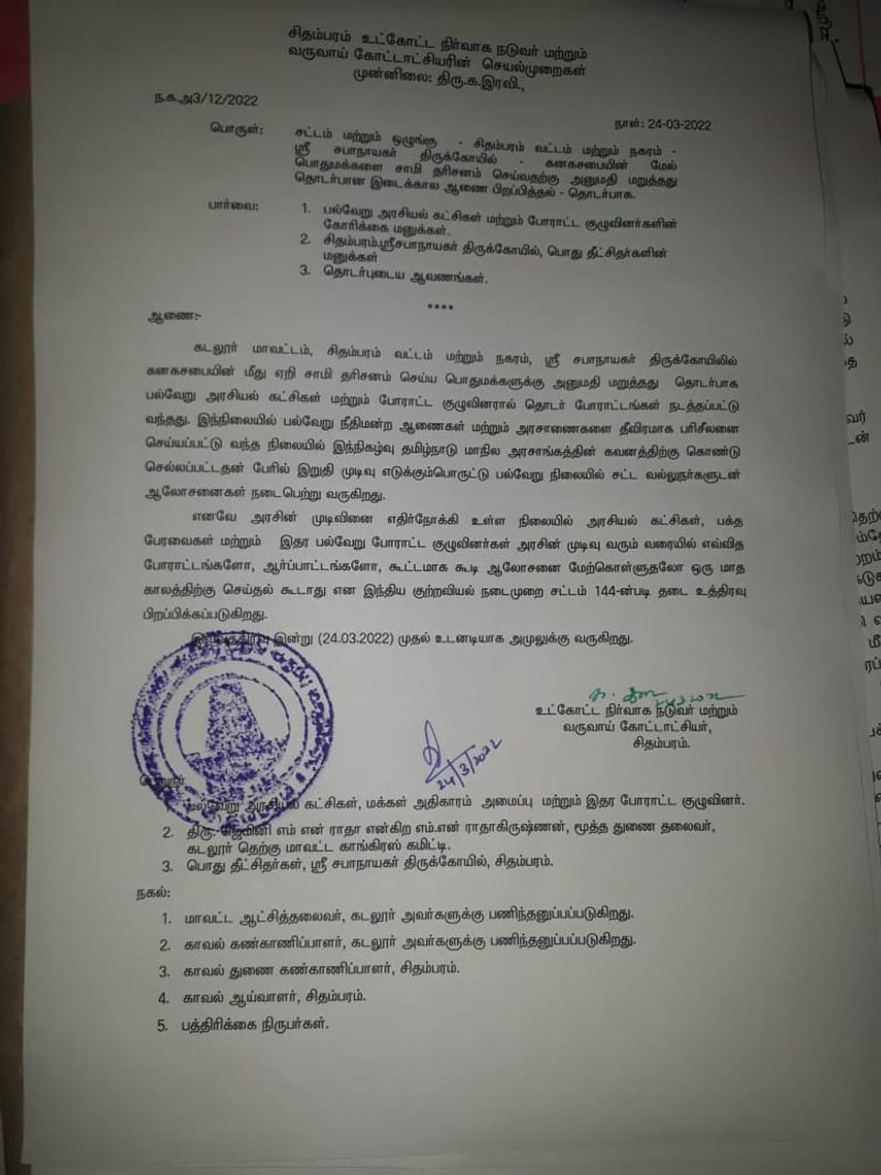 இதுக்குறித்து வெளியிடப்பட்டுள்ள அறிவிப்பில், சிதம்பரம் நடராஜர் கோவிலில் நடராஜர் சன்னிதியில் மேடையேறி தேவாரம் திருவாசகம் பாடுவதற்கு சம்பந்தமாக ஏற்பட்டுள்ள சட்டப் பிரச்சனைகள் காரணமாக அரசின் அடுத்த முடிவு சட்ட வல்லுனர்கள் ஆலோசிக்கப்பட்டு வருவதாக இன்று முதல் ஒரு மாத காலத்திற்கு சிதம்பரம் பகுதியில் மேற்கண்ட நடராஜர் கோவில் சம்பந்தமாக அரசியல் கட்சிகள் சமூக இயக்கங்கள் ஆர்ப்பாட்டம் செய்ய 144 தடை உத்தரவு பிறப்பித்துள்ளதாக சிதம்பரம் ஆர்டிஓ ரவி உத்தரவு பிறப்பித்து அறிவிப்பு செய்துள்ளார்.