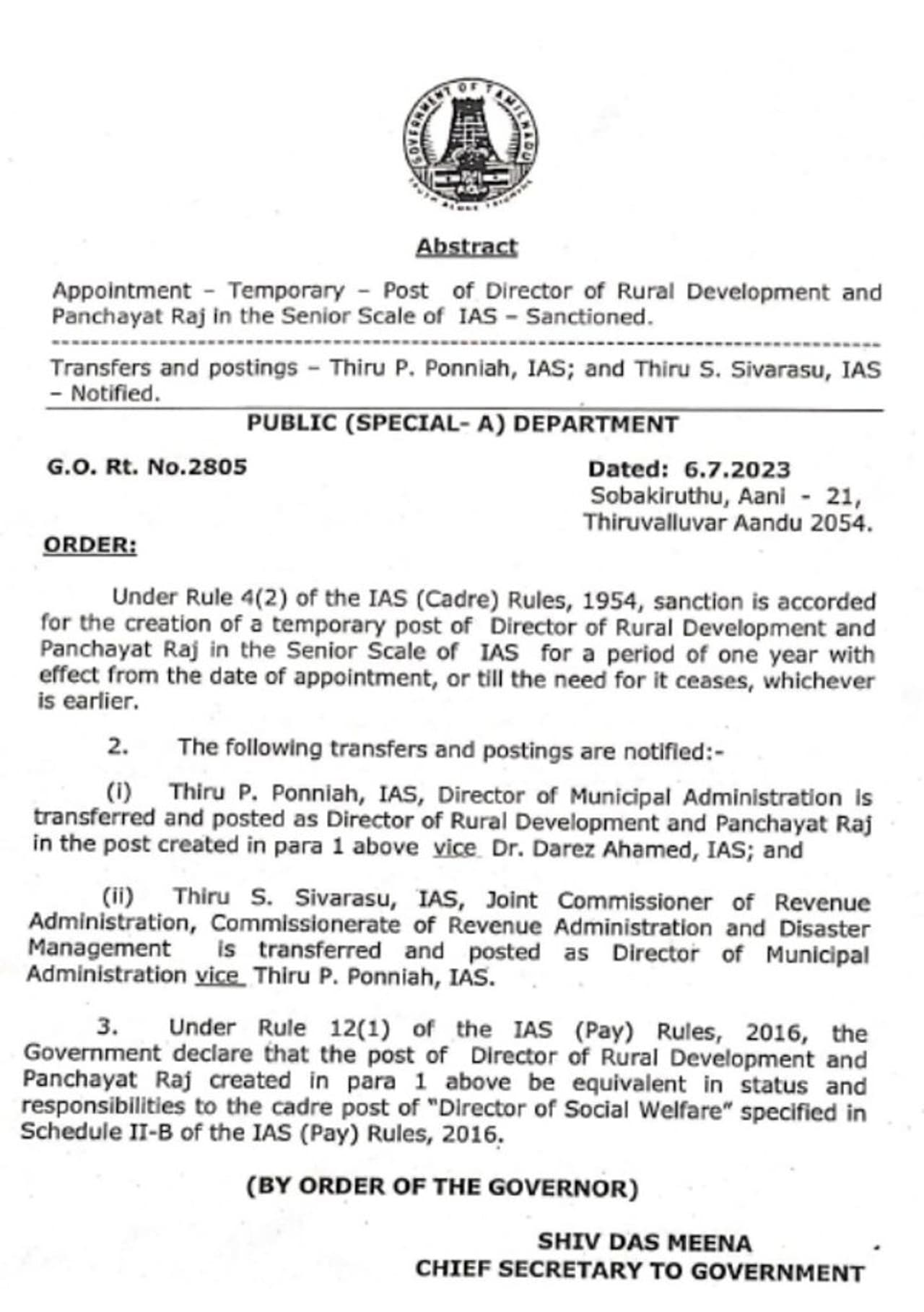அதேபோல், கடந்த சில தினங்களுக்கு முன்பாக தமிழகத்தில் முக்கியத் துறைகளின் செயலாளர்கள் உள்பட ஐஏஎஸ் அதிகாரிகளை பணியிட மாற்றம் செய்யப்பட்டு இருந்தனர். இந்நிலையில், தற்போது இரண்டு ஐஏஎஸ் அதிகாரிகள் பணியிட மாற்றம் செய்யப்பட்டுள்ளனர். நகராட்சி நிர்வாக இயக்குனர் பொன்னையா ஊரக வளர்ச்சி துறை இயக்குனராகவும், வருவாய் துறை இணை ஆணையர் சிவராசு நகராட்சி நிர்வாக இயக்குனராக நியமனம் செய்யப்படுவதாக தலைமை செயலாளர் ஷிவ்தாஸ் மீனா உத்தரவு பிறப்பித்துள்ளார்.