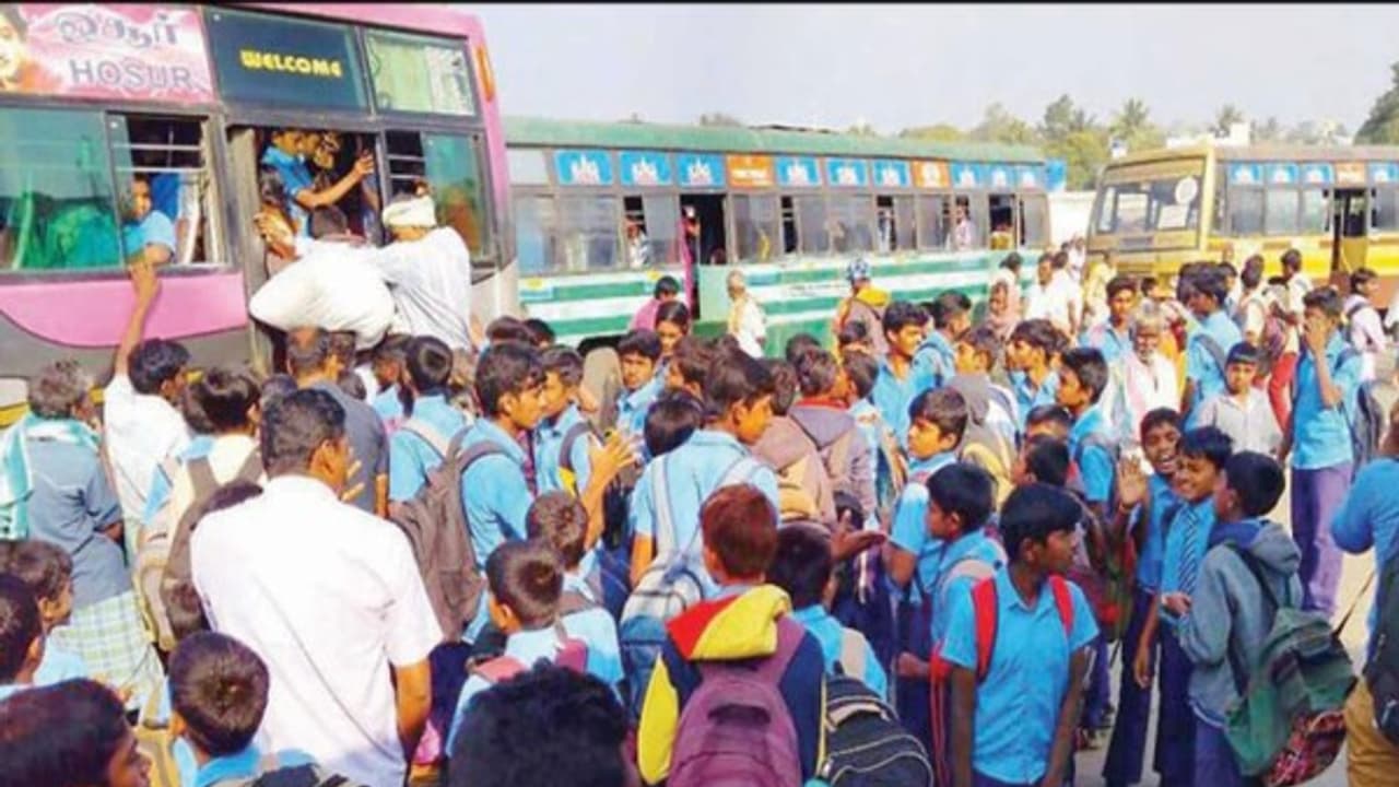 தனியார் பேருந்துகளில் கூட்டம் அதிகளவில் இருந்ததால் மாணவர்கள் முந்திக் கொண்டு பேருந்துகளில் ஏறினர். சில மாணவர்கள் படிக்கட்டுகளில் தொங்கியபடி பயணம் செய்தனர்.