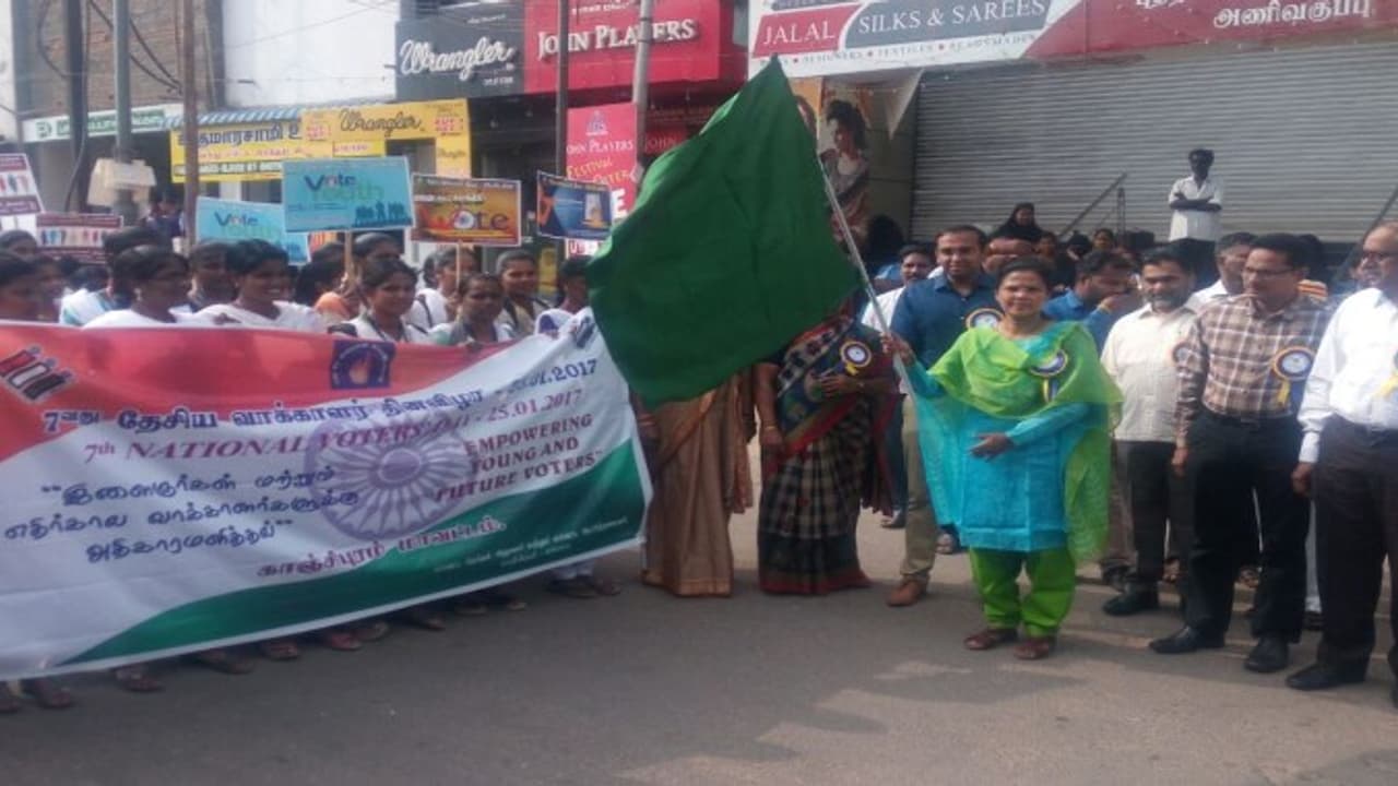 காஞ்சிபுரம் மாவட்டத்தில் உள்ள காந்தி சாலையில் தேசிய வாக்காளர் தின விழா பேரணியை மாவட்ட ஆட்சியர் கெஜலட்சுமி கொடி அசைத்து தொடங்கி வைத்தார்.