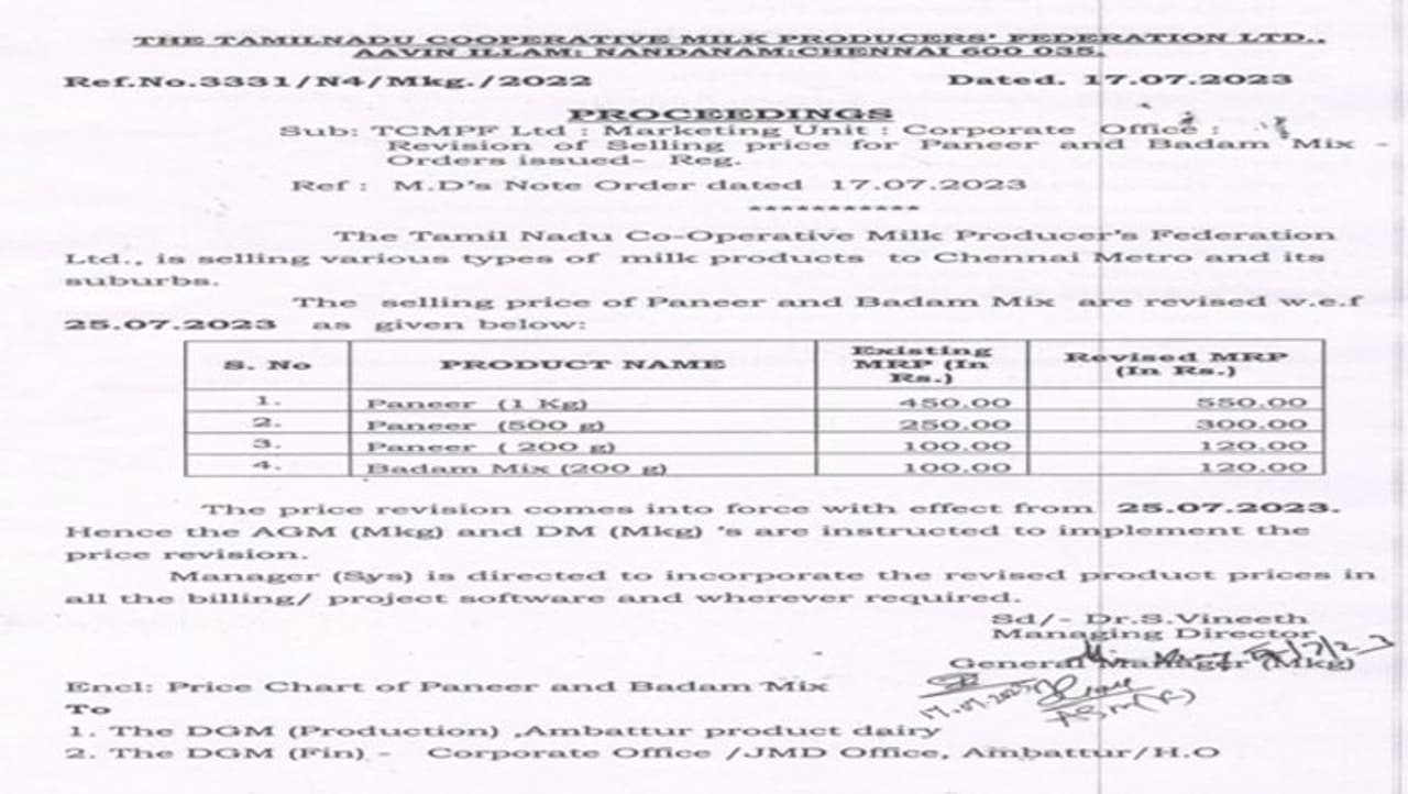 ஆவின் விற்கப்படும் பன்னீர் மற்றும் பாதாம் பவுடர் ஆகியவற்றின் விலையை ஆவின் நிர்வாகம் உயர்த்தியுள்ளது