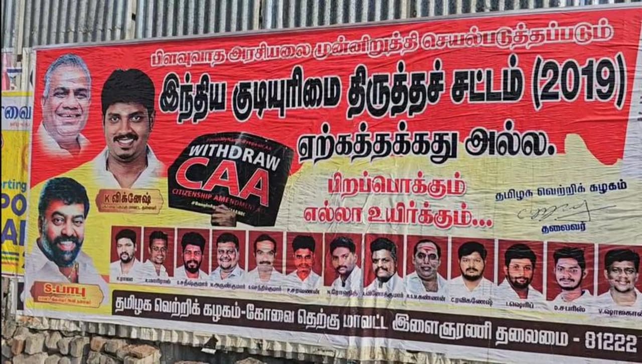 இந்தநிலையில், கோவை மாநகரில் பல்வேறு இடங்களில் இந்த சட்டம் ஏற்கத்தக்கது அல்ல என குறிப்பிட்டு தமிழக வெற்றிக் கழகத்தின் கோவைத் தெற்கு மாவட்ட இளைஞரணி சார்பில் போஸ்டர்கள் ஒட்டப்பட்டுள்ளன. அந்த போஸ்டரில் "பிளவுவாத அரசியலை முன்னிறுத்தி செயல்படுத்தப்படும் இந்திய குடியுரிமை திருத்தச் சட்டம் (2019) ஏற்கத்தக்கது அல்ல" "Withdraw CAA" என குறிப்பிடப்பட்டுள்ளது.