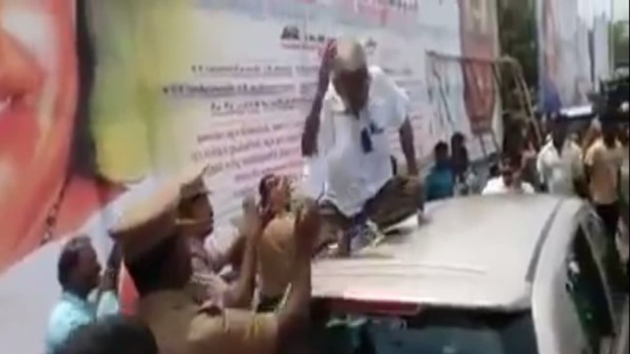 அதற்காக, காரின் மேல் அமர்ந்து போராட்டத்தில் ஈடுபட்ட டிராபிக் ராமசாமி உடம் போலீசார் பேச்சு வார்த்தை நடத்தி வாகனத்தில் இருந்து அவரை கீழே இறங்க சொல்லி கேட்டனர்.