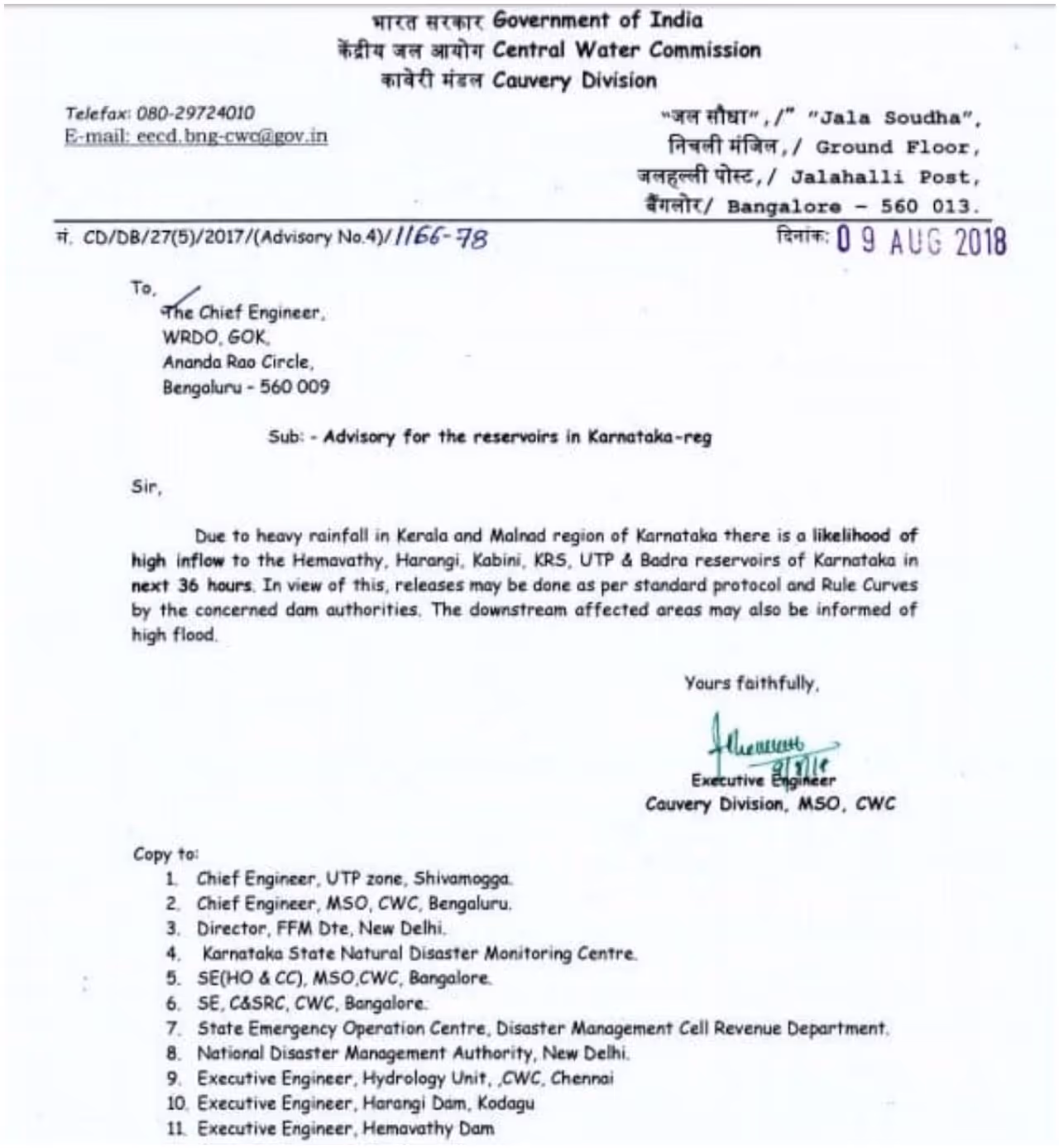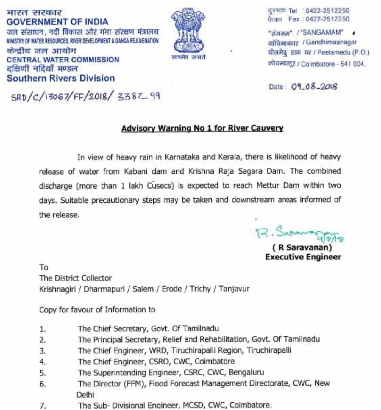 கேரளா மற்றும் கர்நாடக தமிழகத்தில் 6 மாவட்ட ஆட்சியருக்கு மத்திய அரசு எச்சரிக்கை விடுத்துள்ளது .கர்நாடகா, மற்றும் கேரளாவில் அதிக அளவில் மழை பெய்வதால் அணைகளில் உபரி நீர் அதிகமாக வெளியேற்றப்பட்டு வருகிறது.