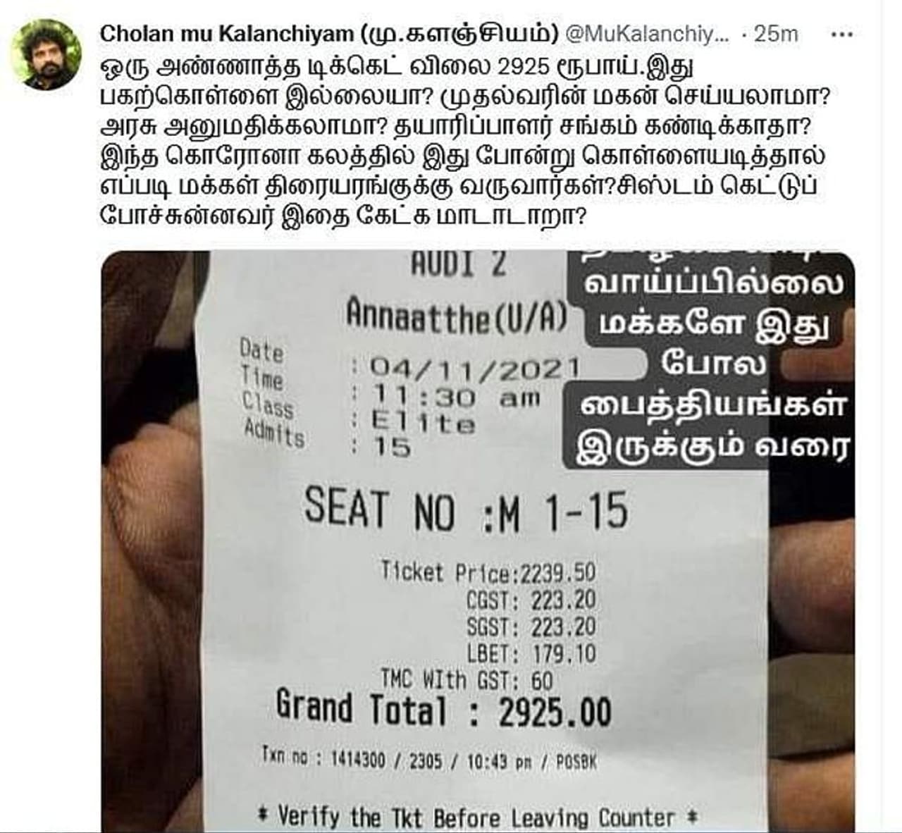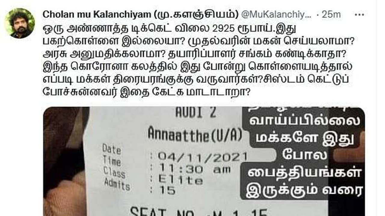 ஒரு அண்ணாத்த டிக்கெட் விலை ரூ.2925. இது பகற்கொள்ளை இல்லையா ? முதல்வரின் மகன் இப்படி செய்யலாமா? அரசு அனுமதிக்கலாமா? தயாரிப்பாளர்கள் சங்கம் கண்டிக்காதா ?