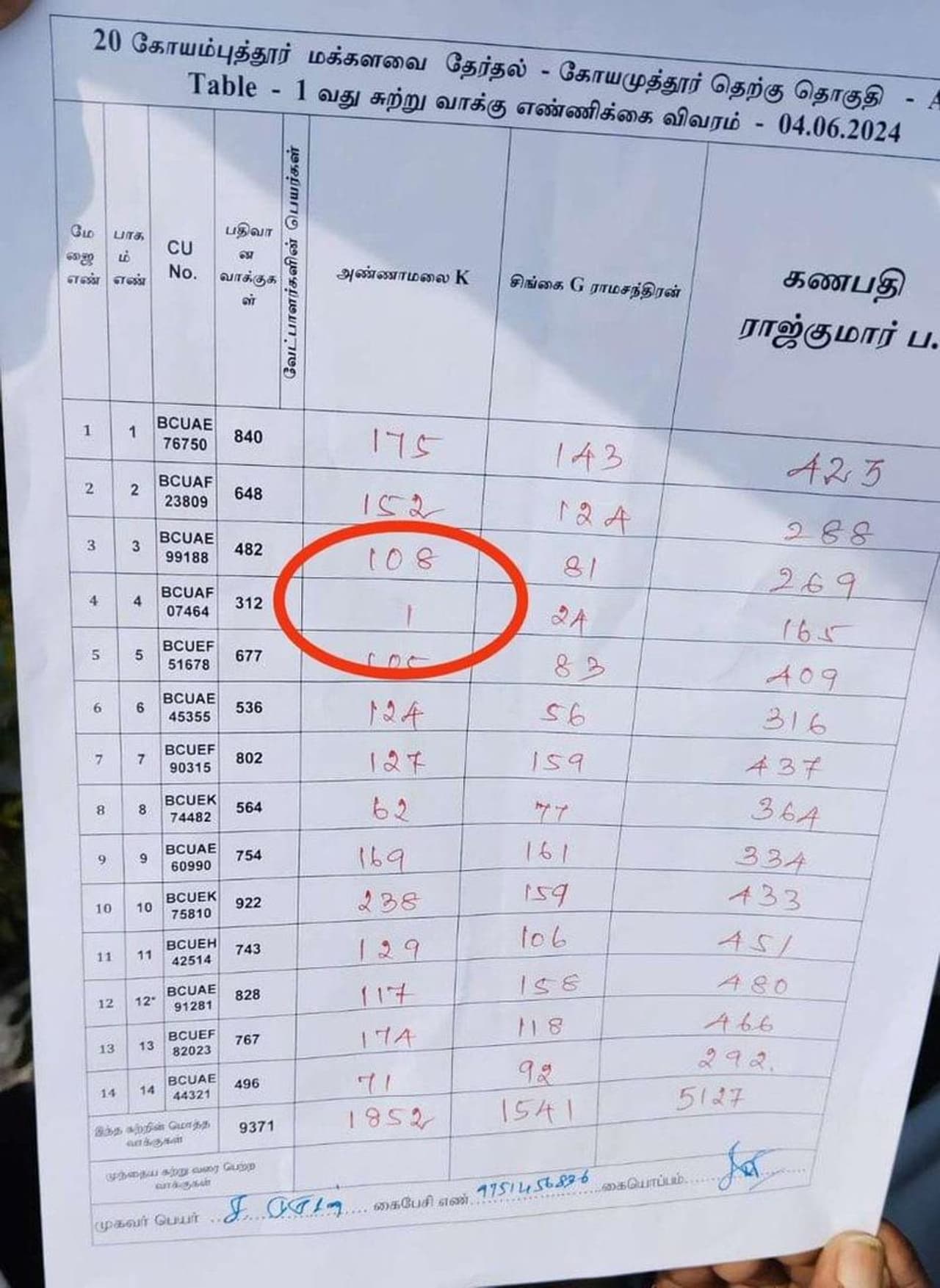 நாடாளுமன்ற தேர்தல் வாக்கு எண்ணிக்கை நடைபெற்று வரும் நிலையில், கோவையில் வாக்கு எண்ணிக்கையின் போது ஒரு தொகுதியில் அண்ணாமலை ஒரே ஒரு வாக்குகள் மட்டுமே பெற்றது பாஜகவினரை அதிர்ச்சி அடையவைத்துள்ளது.