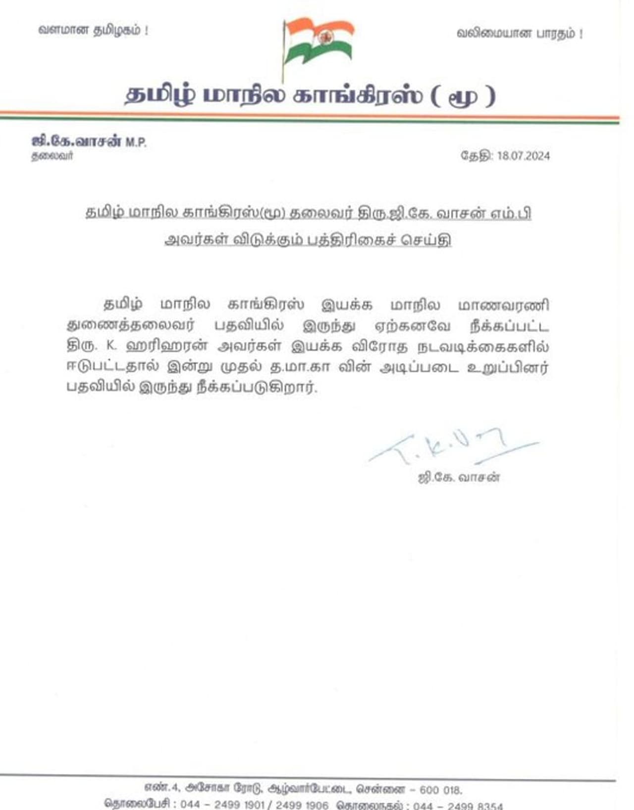 இதுதொடர்பாக தமிழ் மாநில காங்கிரஸ் கட்சியின் தலைவர் ஜி.கே.வாசன் வெளியிட்டுள்ள செய்தியில்: தமிழ் மாநில காங்கிரஸ் இயக்க மாநில மாணவரணி துணைத்தலைவர் பதவியில் இருந்து ஏற்கனவே நீக்கப்பட்ட ஹரிஹரன் அவர்கள் இயக்க விரோத நடவடிக்கைகளில் ஈடுபட்டதால் இன்று முதல் த.மா.கா.வின் அடிப்படை உறுப்பினர் பதிவியில் இருந்து நீக்கப்படுவதாக அறிவிப்பு வெளியாகியுள்ளது.