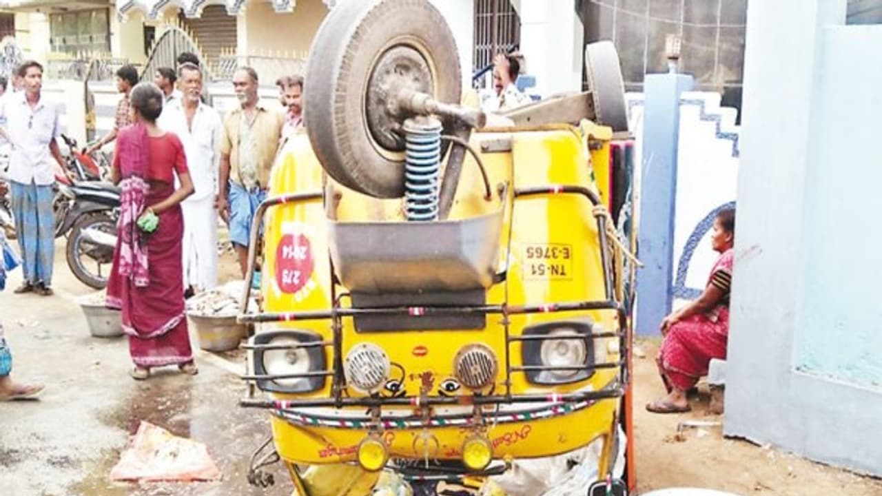ஆனால், ஓட்டுநரின் கட்டுப்பாட்டை இழந்த ஆட்டோ முன்னால் சென்ற சைக்கிளில் மோதியது. அதுமட்டுமின்றி நடுரோட்டில் தலைகுப்புற கவிழ்ந்தது.