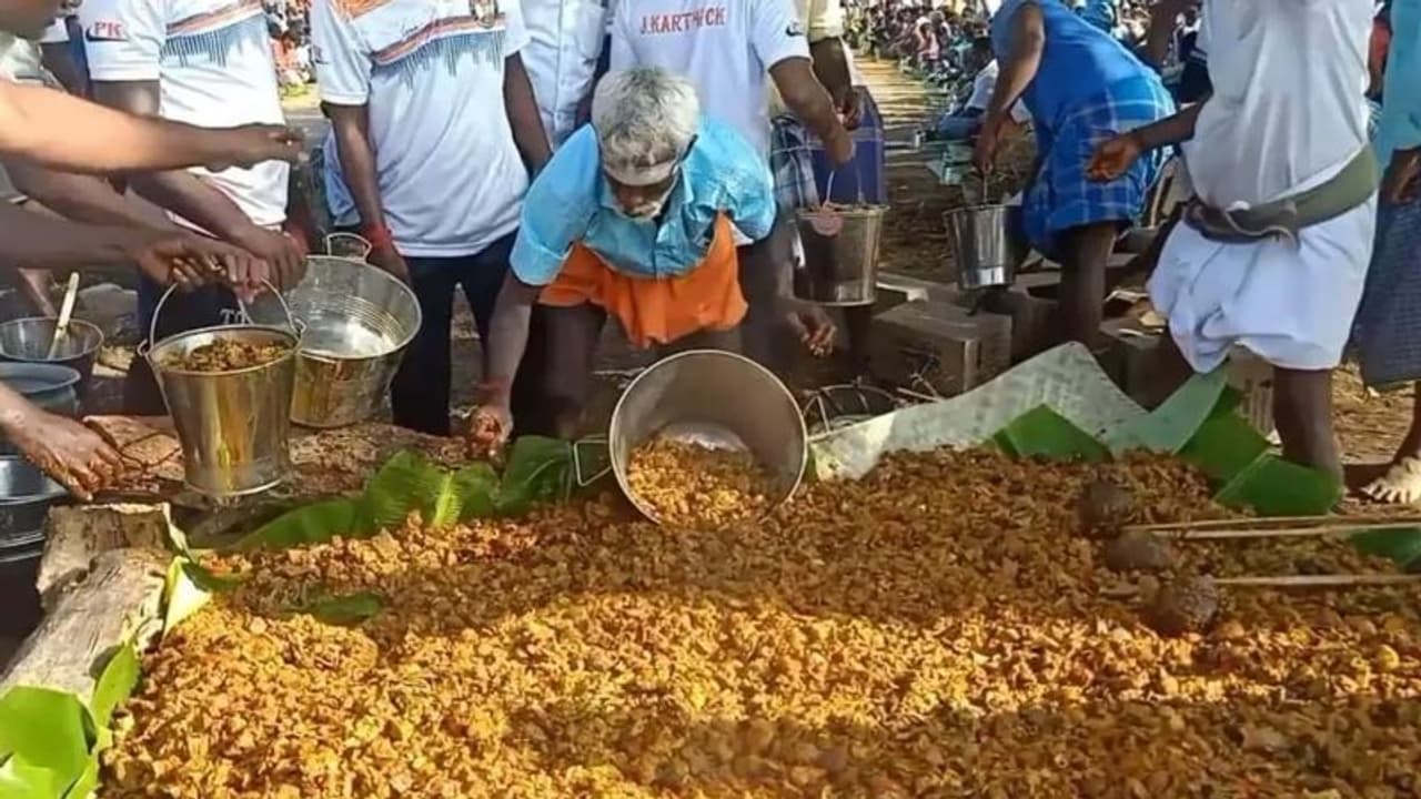 பின்னர் நேர்த்திக்கடனாக கோவிலில் செலுத்தி வளர்க்கப்பட்ட 50 ஆடுகள் பலியிடப்பட்டு உணவு சமைக்கப்பட்டது. 50 மூடை அரிசியில் சாதம் தயாரானது. இந்த கறி விருந்து அங்கு கூடியிருந்த சுமார் 10 ஆயிரத்திற்கும் மேற்பட்ட ஆண்களுக்கு வழங்கப்பட்டது. இலை போட்டு சாதமும், ஆட்டுகறி குழம்பும் ஆண்களுக்கு பிரசாதமாக பறிமாறப்பட்டது.
