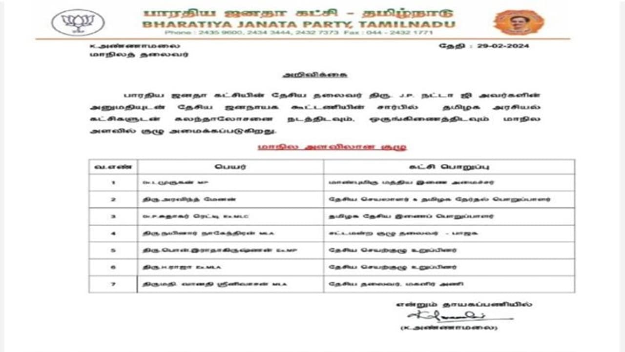 இந்த நிலையில், மக்களவைத் தேர்தலை முன்னிட்டு கூட்டணி கட்சிகளுடன் பேச்சுவார்த்தை நடத்த பாஜக குழு அமைத்துள்ளது. அக்குழுவில் மத்திய இணையமைச்சர் எல்.முருகன், தமிழக தேர்தல் பொறுப்பாளர் அரவிந்த் மேனன், தமிழக தேசிய இணைப் பொறுப்பாளர் சுதாகர் ரெட்டி, எம்.எல்.ஏ.க்கள் நயினார் நாகேந்திரன், வானதி சீனிவாசன், தேசிய செயற்குழு உறுப்பினர்கள் பொன்.ராதாகிருஷ்ணன், ஹெச்.ராஜா ஆகியோர் இடம்பெற்றுள்ளனர்.