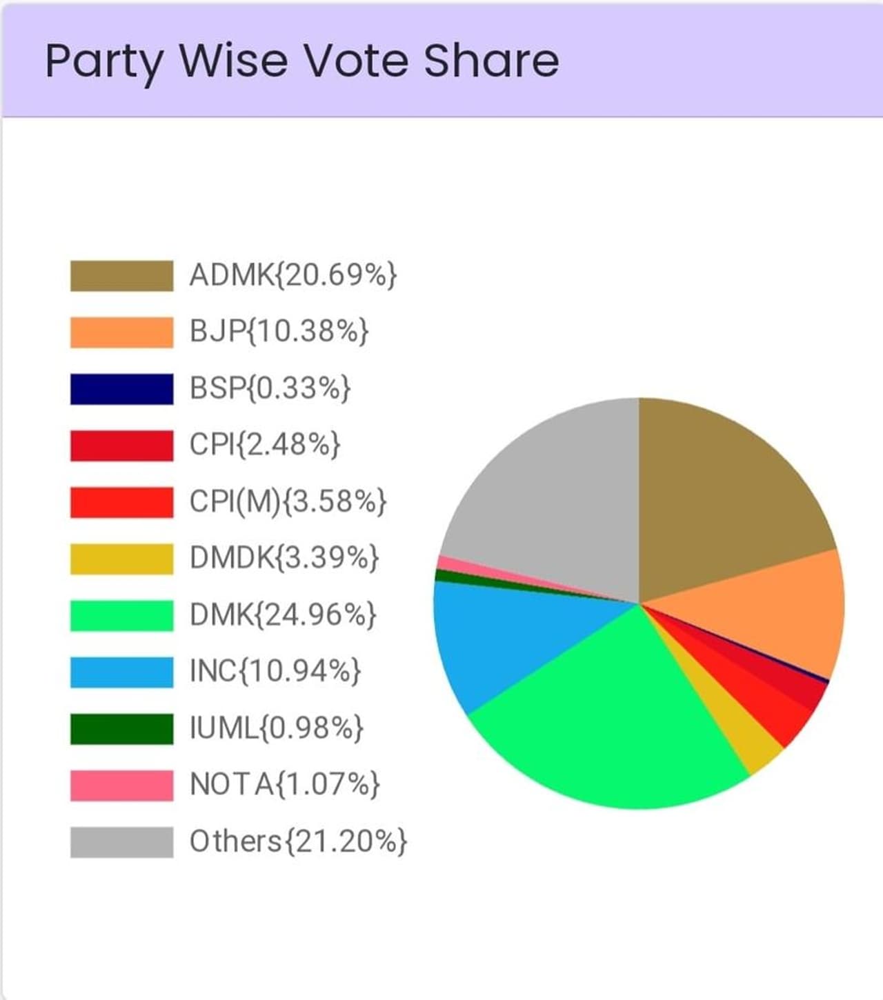 பாஜகவை பொறுத்தவரை 10.38% வாக்குகளை இந்த முறை தமிழகத்தில் இருந்து தனித்து பெற்றுள்ளது. மேலும் மார்க்சிஸ்ட் கம்யூனிஸ்ட் கட்சி 3.58% சதவிகிதமும், இந்திய கம்யூனிஸ்ட் கட்சி 2.48 வாக்கு சதவிகிதமும், தேமுதிக 3.39 சதவீத வாக்குகளையும் பெற்றுள்ளது. நோட்டாவை பொறுத்தவரை தற்போது வரை 1. 07% வாக்குகள் பெற்றுள்ளது மற்ற சுயேட்சைகளை பொறுத்த வரை 21 புள்ளி 2 0 சதவீத வாக்குகளை பெற்றுள்ளன.