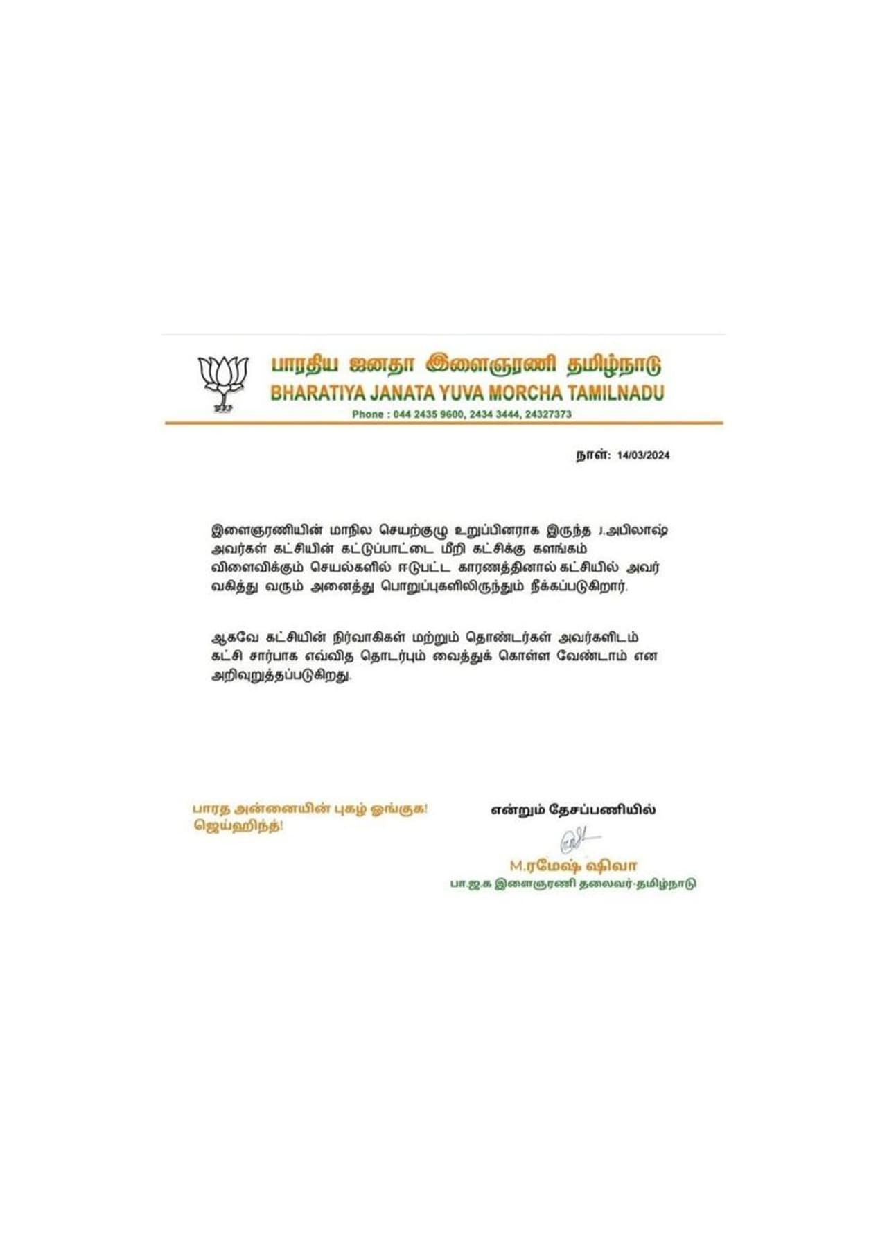 இதுதொடர்பாக தமிழ்நாடு பாஜக இளைஞரணி தலைவர் ரமேஷ் ஷிவா வெளியிட்டுள்ள செய்தி குறிப்பில்: இளைஞரணியின் மாநில செயற்குழு உறுப்பினராக இருந்த அபிலாஷ் கட்சியின் கட்டுப்பாட்டை மீறி கட்சிக்கு களங்கம் விளைவிக்கும் செயல்களில் ஈடுபட்ட காரணத்தினால் கட்சியில் அவர் வகித்து வரும் அனைத்து பொறுப்புகளில் இருந்தும் நீக்கப்படுகிறார்.