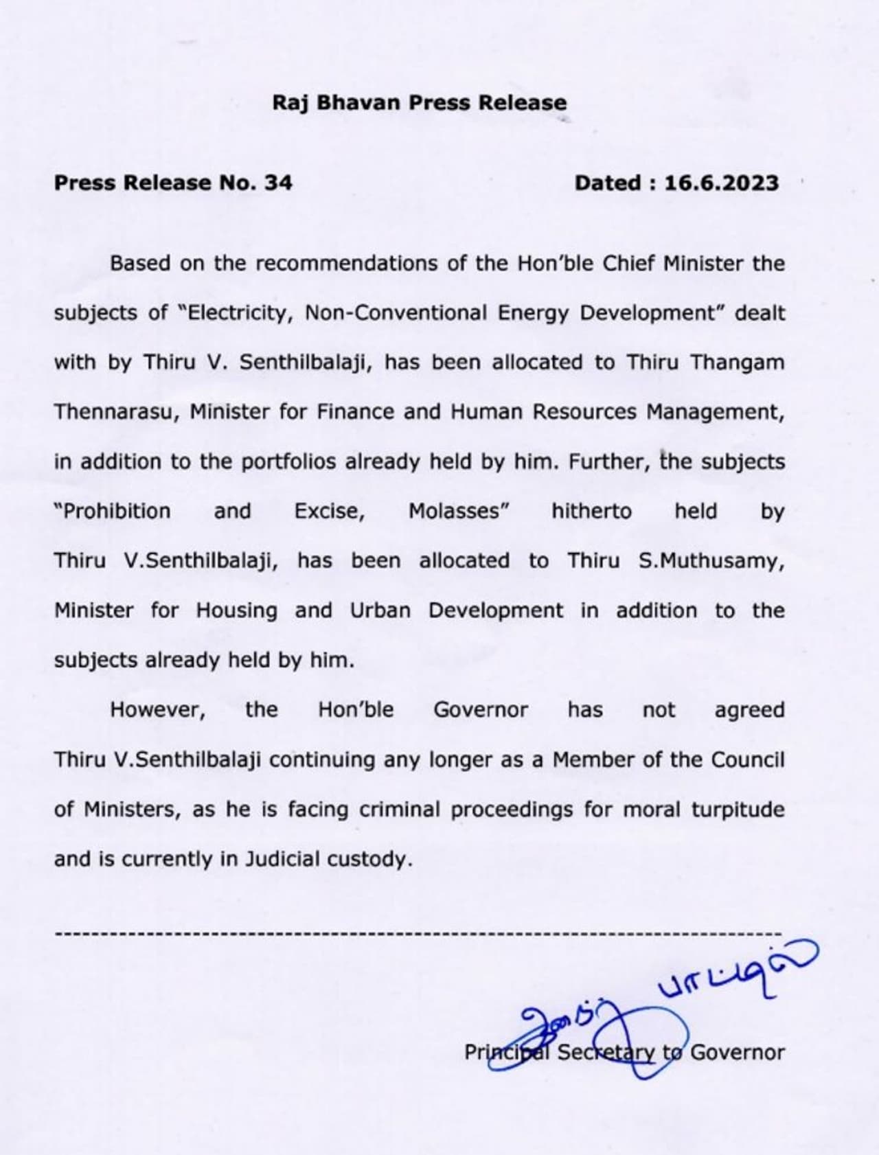 இந்நிலையில் செந்தில் பாலாஜி மீது குற்றவியல் வழக்கு இருப்பதால் அமைச்சராக தொடர முடியாது என்று கூறி முதல்வரின் பரிந்துரையை ஏற்க ஆளுநர் மீண்டும் மறுத்துள்ளார். அதாவது இலாகா இல்லாத அமைச்சராக செந்தில் பாலாஜி தொடர முடியாது என்று ஆளுநர் தெரிவித்துள்ளார். இதன் மூலம் முதலமைச்சரின் பரிந்துரையை ஏற்க ஆளுநர் மீண்டும் மறுத்துள்ளார். எனினும் முத்துசாமி மற்றும் தங்கம் தென்னரசுவுக்கு கூடுதல் துறை ஒதுக்கப்படுவதற்கு ஆளுநர் ஆர்.என்.ரவி ஒப்புதல் அளித்துள்ளார்.