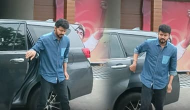 மாவட்ட பொறுப்பாளர்கள் பனையூர் இல்லம் முன்பு குவிந்த நிலையில், அவர்களை சந்திக்க கருப்பு பேண்ட் மற்றும் ஊதா நிற ஷர்ட் அணிந்தபடி யங் லுக்கில் மாஸ் எண்ட்ரி கொடுத்தார் நடிகர் விஜய்.