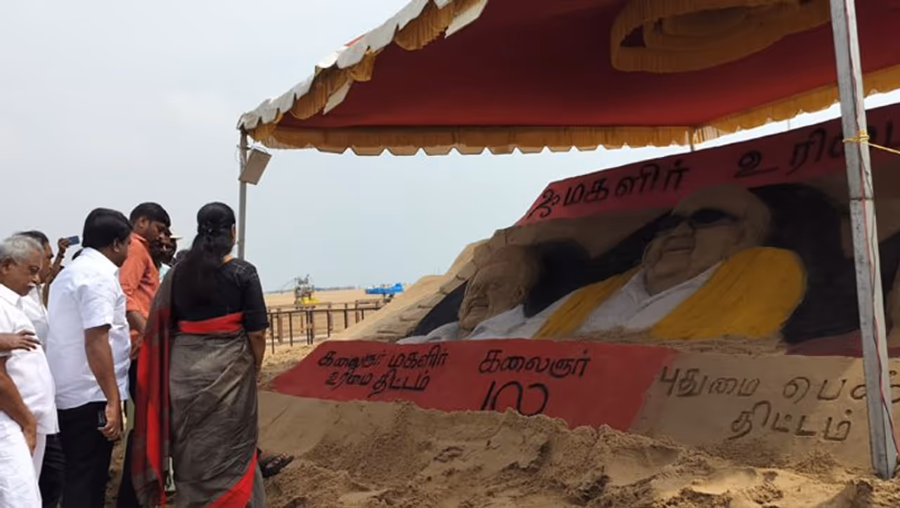 இன்று திமுக மகளிர் உரிமை மாநாட்டை முன்னிட்டு மெரினா கடற்கரையில் மறைந்த முன்னாள் முதல்வர் கருணாநிதி, முதல்வர் மு.க. ஸ்டாலின், திமுக எம்.பி. கனிமொழியை மணல் சிற்பமாக வடிவமைத்துள்ளனர்.