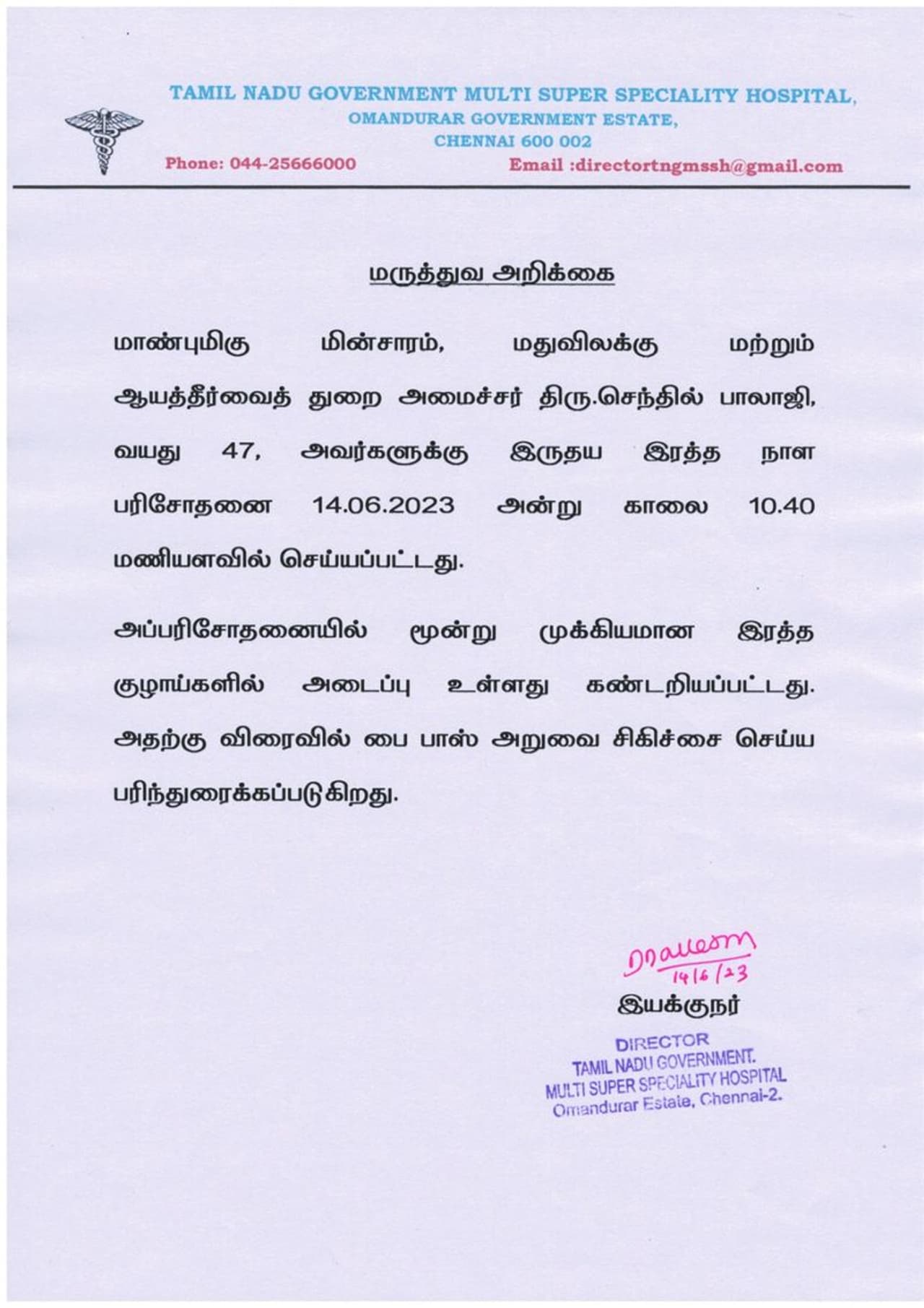 அமைச்சர் செந்தில் பாலாஜிக்கு 3 முக்கிய ரத்த குழாய்களில் அடைப்பு உள்ளதை அடுத்து விரைவில் பை பாஸ் சர்ஜரி செய்ய ஓமந்தூரார் மருத்துவமனை மருத்துவர்கள் பரிந்துரை செய்துள்ளனர்.