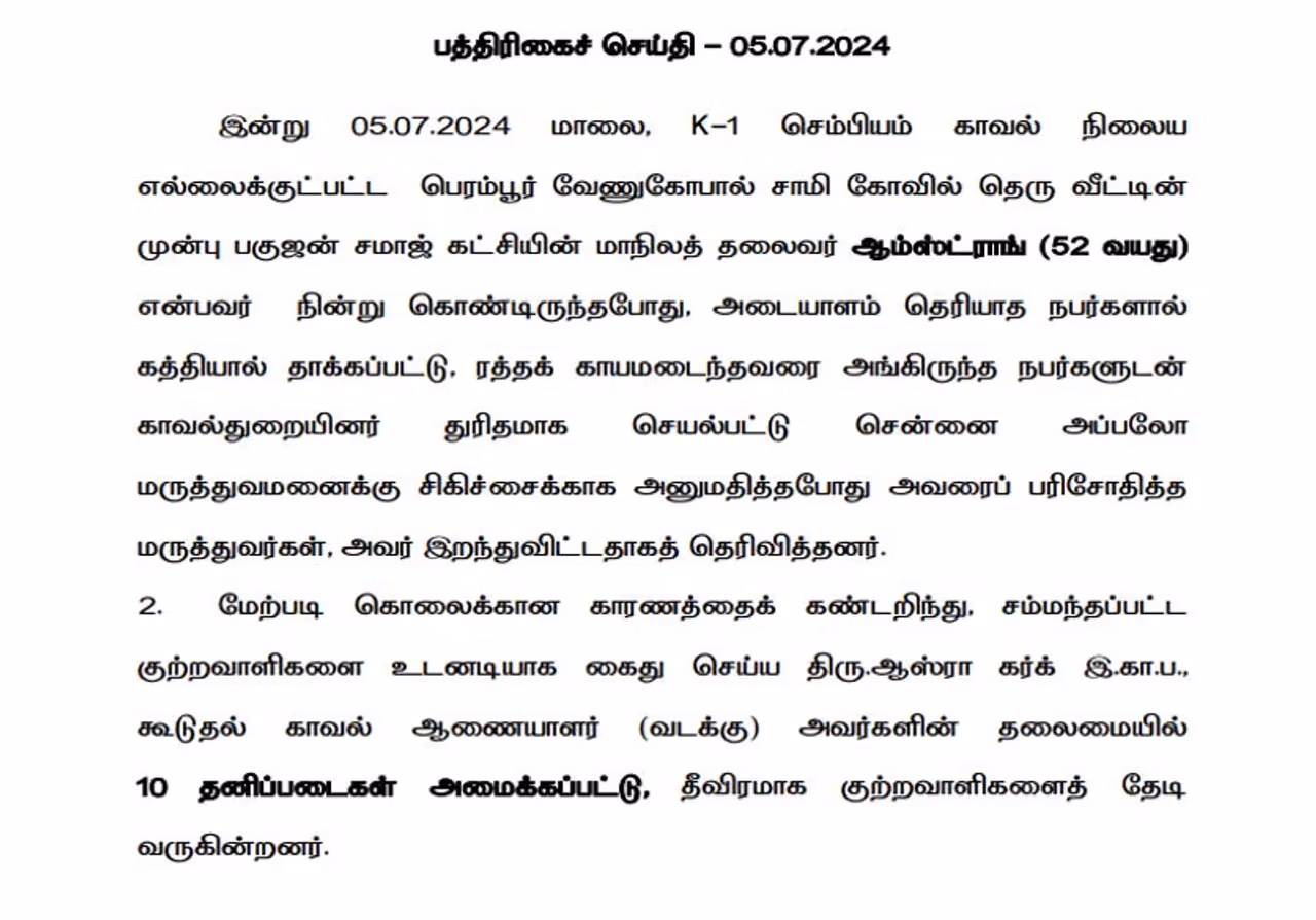 இதுகுறித்து வெளியான அறிக்கையில் "இன்று ஜூலை 5ஆம் தேதி மாலை பெரம்பூர் வேணுகோபால்சாமி கோவில் தெருவில் உள்ள தன் வீட்டின் முன், பகுஜன் சமாஜ் கட்சியின் மாநில தலைவர் ஆர்ம்ஸ்ட்ராங் (வயது 52) என்பவர் நின்று கொண்டிருந்த பொழுது, அடையாளம் தெரியாத நபர்களால் கத்தியால் தாக்கப்பட்டு ரத்த காயம் அடைந்த அவரை, அங்கிருந்த நபர்களுடன் காவல்துறையினர் துரிதமாக செயல்பட்டு சென்னை அப்போலோ மருத்துவமனைக்கு சிகிச்சைக்கான அனுமதித்த பொழுது அவரை பரிசோதித்த மருத்துவர்கள் அவர் இறந்துவிட்டதாக தெரிவித்தனர்.