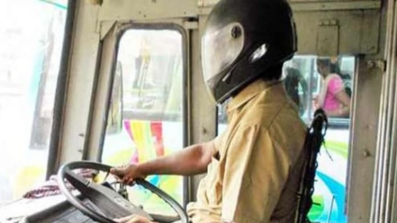 இந்நிலையில் கோபி அரசு போக்குவரத்து பணிமனையில் பணிபுரியும் அண்ணா தொழிற்சங்க டிரைவரான எஸ்.எஸ். சிவக்குமார் ஹெல்மெட் அணிந்து பேருந்து ஓட்டும் பணியில் ஈடுபட்டுள்ளார்.