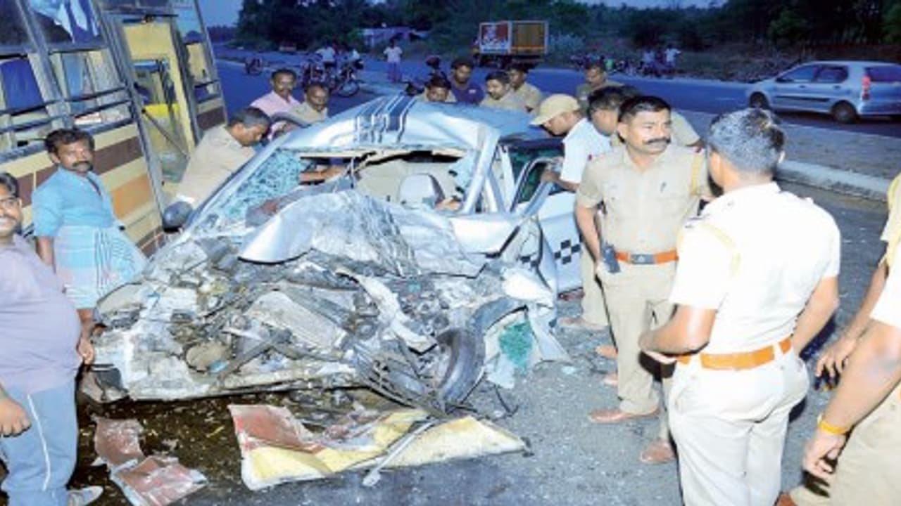 சிவகங்கை மாவட்டம் திருப்புவனம் அருகே மாரநாடு பகுதியில் நான்கு வழிச்சாலையில் கார் வந்து கொண்டிருந்தபோது எதிரே பேருந்து ஒன்று வந்துக் கொண்டிருந்தது.