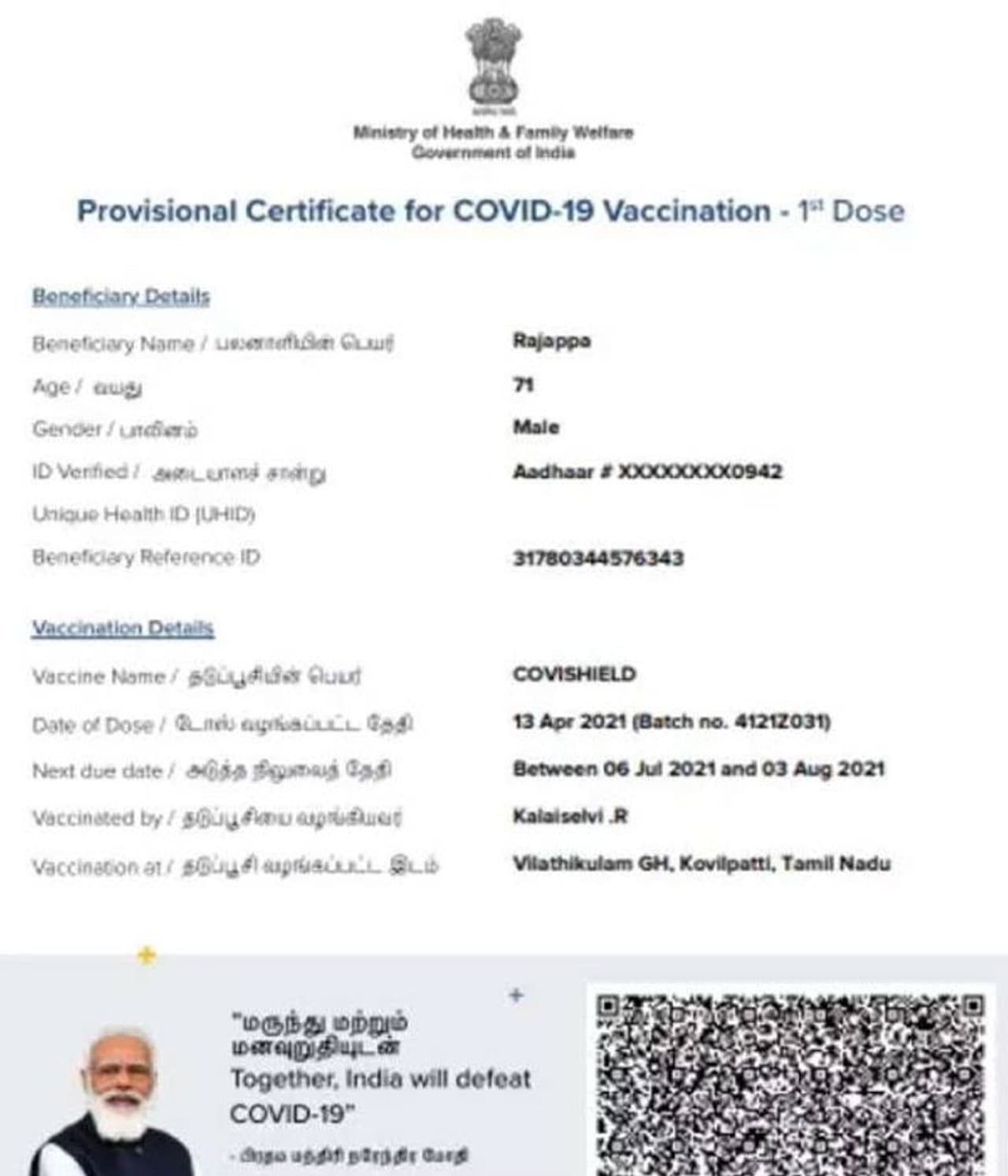 இந்நிலையில் தூத்துக்குடி அருகே கடந்த மே மாதமே உயிரிழந்த ஒருவருக்கு தடுப்பூசி செலுத்தியதாக வந்த தகவலால் உறவினர்கள் அதிர்ச்சி அடைந்துள்ளனர். தூத்துக்குடி மாவட்டம் விளாத்திகுளம் அருகில் உள்ள கிராமத்தைச் சேர்ந்த ராஜப்பா என்பவர் கடந்த ஏப்ரல் மாதம் 20ஆம் தேதி உயிரிழந்தார். முதல் டோஸ் தடுப்பு ஊசி செலுத்தப்பட்ட ராஜப்பா கொரோனா காரணமாக இருந்ததாகவும், கடந்த ஆண்டு ஏப்ரல் மாதம் 13ஆம் தேதியன்று அவருக்கு முதல் தவணை கொரோனா தடுப்பூசி செலுத்தப்பட்டுள்ளது.