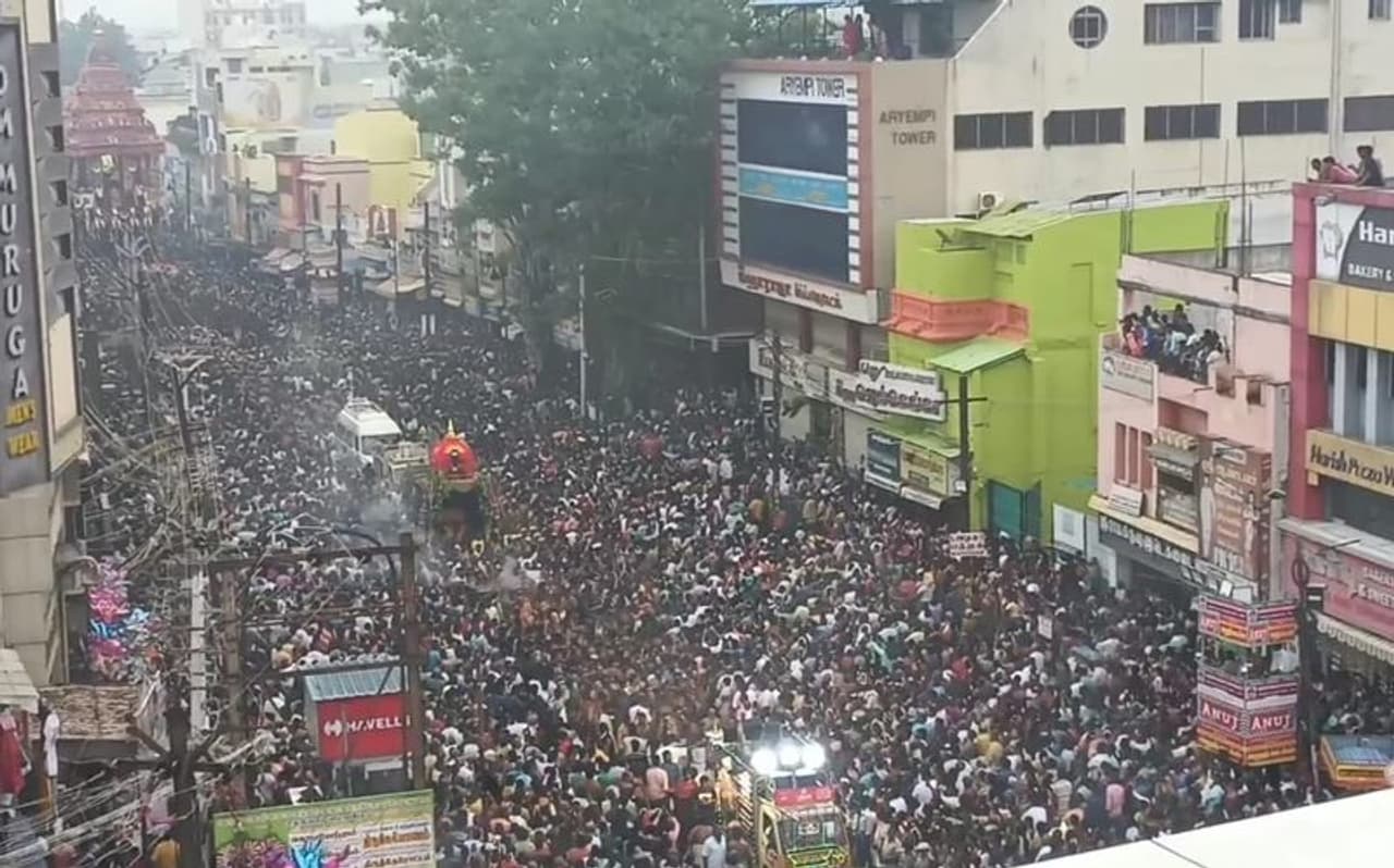 மாசி வீதிகளிள் ஆடி அசைந்து வந்த மீனாட்சி சுந்தரேஸ்வரர் திருத்தேரின் முன்பாக ஏராளமான சிவ பக்தர்கள் சங்கு முழங்கியபடியும், பல்வேறு இசைகளை இசைத்தபடியும் மீனாட்சி- சுந்தரேசுவரர் பதிகம் பாடியபடியும், ஹர ஹர சிவா என்ற பக்தி கோஷங்களை எழுப்பியபடி பல்லாயிரக்கணக்கான பக்தர்கள் தேரை வடம் பிடித்து இழுத்துசென்று வணங்கிவருகின்றனர். தேரோட்டத்தை காண மதுரை மற்றும் சுற்று வட்டாரங்களில் இருந்தும் அண்டை மாநிலங்களிலிருந்தும், வெளிநாடுகளிலிருந்தும் பல்லாயிரக்கணக்கான பக்தர்கள் வருகை தந்துள்ளதால் மதுரை மாநகர காவல்துறை சார்பில் ஆயிரத்திற்கு மேற்பட்ட கவால்துறையினர் பலத்த பாதுகாப்பு போடப்பட்டுள்ளது.