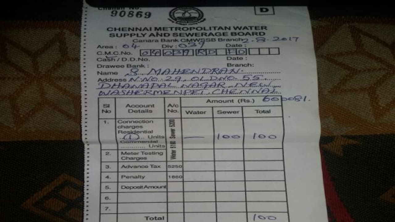 இந்நிலையில் சென்னை புதுவண்ணாரப்பேட்டை தனபால் நகரை சேர்ந்தவர் மகேந்திரன்.இவரது வீட்டுக்கு குடிநீர் இணைப்பு கேட்டு, மனு செய்து இருந்தார். அதன்பேரில் ஊழியர்கள், அவரது வீட்டில் இணைப்பு கொடுத்தனர். அதற்கான தொகையாக ரூ.2,500 வசூல் செய்தனர். ஆனால், அவருக்கு கொடுத்த ரசீதில் ரூ.100 என எழுதி கொடுத்து சென்றனர். இதனால், அவர் கடும் வேதனையும், அதிர்ச்சியும் அடைந்தார்.