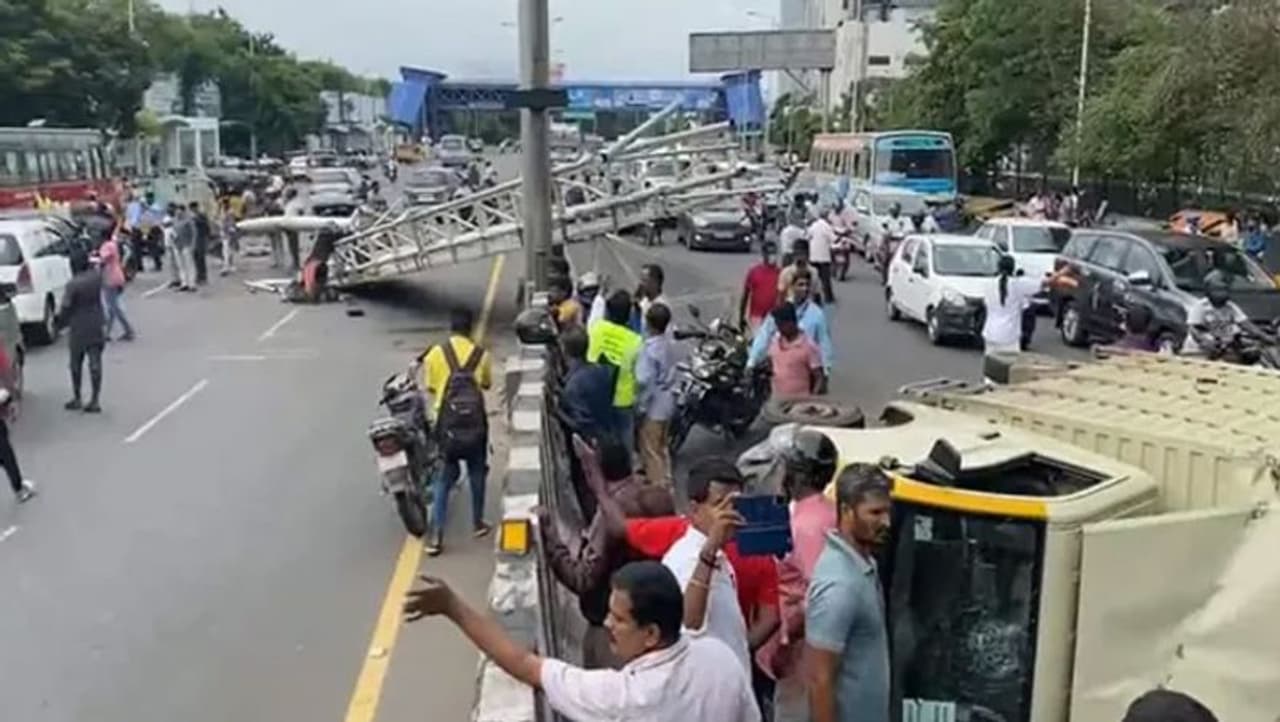 சென்னை கத்திப்பாரா அருகே வழிகாட்டி பலகை பெயர்ந்து சாலையில் சென்ரு கொண்டிருந்த இருசக்கர வாகனம் மீது விழுந்ததில் ஒருவர் சம்பவ இடத்திலேயே உயிரிழந்தார்.