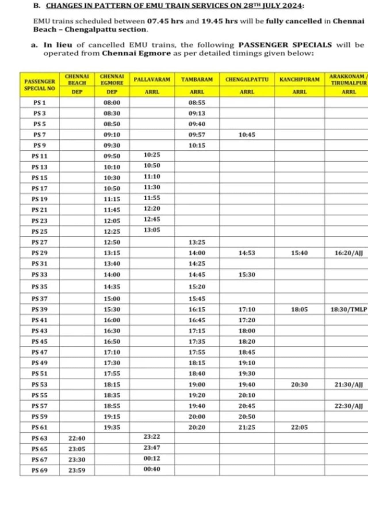 அதேபோல சென்னை எழும்பூரில் இருந்து தொடங்கி, திருச்சி மார்க்கமாக நீண்ட தூரம் செல்லும் ரயில்களும் திருச்சி வரை ரத்து செய்யப்பட்டுள்ளது குறிப்பிடத்தக்கது. மேலும் தற்பொழுது தென்னக ரயில்வே அறிவித்துள்ள தகவலின்படி ஒரு சில சிறப்பு ரயில்களை தவிர சென்னை பீச் முதல் செங்கல்பட்டு வரை இயக்கப்படும் அனைத்து புறநகர் ரயில் சேவைகளும் நாளை காலை 7:45 மணி முதல் இரவு 7:45 மணி வரை ரத்து செய்யப்படும் என்று அறிவித்திருக்கிறது.