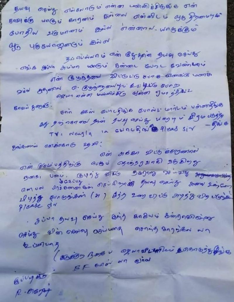மேலும், அவரது வீட்டில் சோதனை செய்தபோது சுரேஷ் எழுதி வைத்திருந்த கடிதம் ஒன்று கைப்பற்றப்பட்டது. அதில், என்னுடைய தற்கொலைக்கு யாரும் காரணம் இல்லை. என்னை மன்னித்துவிடுங்கள். நான் யாருக்கும் பயன் இல்லாமல் உள்ளேன். ஜெயா என்னை மன்னித்துவிடு, உன்னிடம் கூறாமல் இந்த முடிவை எடுத்து விட்டேன். என்று எழுதியிருந்தார்.