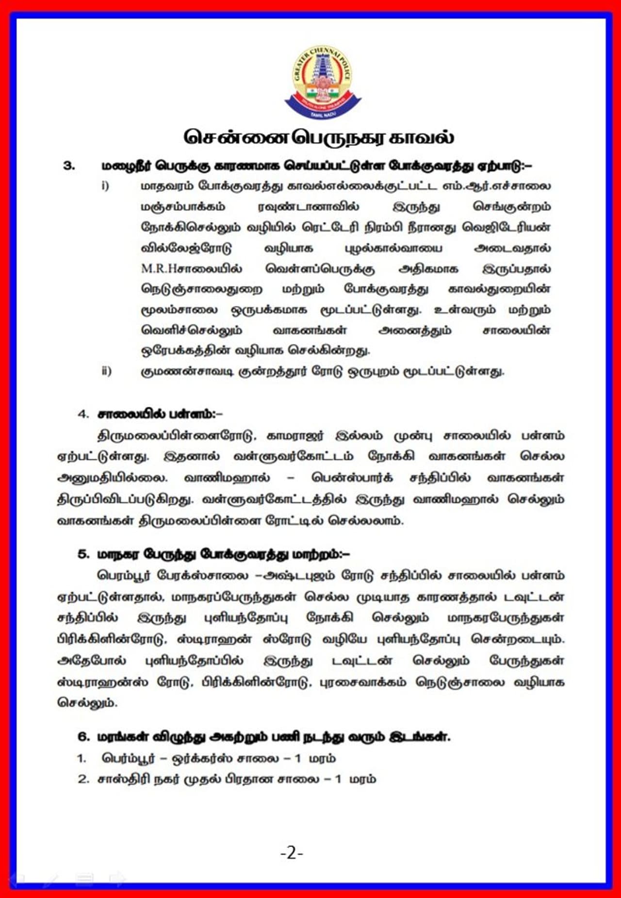 கனமழை மற்றும் வெள்ளம் காரணமாக சென்னையில் மக்கள் வீடுகளை விட்டு வெளியே வர வேண்டாம் என்று அரசால் அரிவுறுத்தப்பட்டுள்ளனர். பல இடங்களிலும் தேசிய மற்றும் மாநில மீட்புக் குழுவினர் முழு வீச்சில் மீட்பு மற்றும் சீரமைப்புப் பணிகளை மேற்கொண்டு வருகின்றனர். இன்று மாலை சென்னை அருகே புயல் கரை கடக்கும் என்றும் எச்சரிக்கப்பட்டுள்ளது. இந்நிலையில் சென்னை பெரு நகர காவல்துறை சார்பில் வெளியிடப்பட்டுள்ள அறிக்கையில், வெள்ளம் காரணமாக,