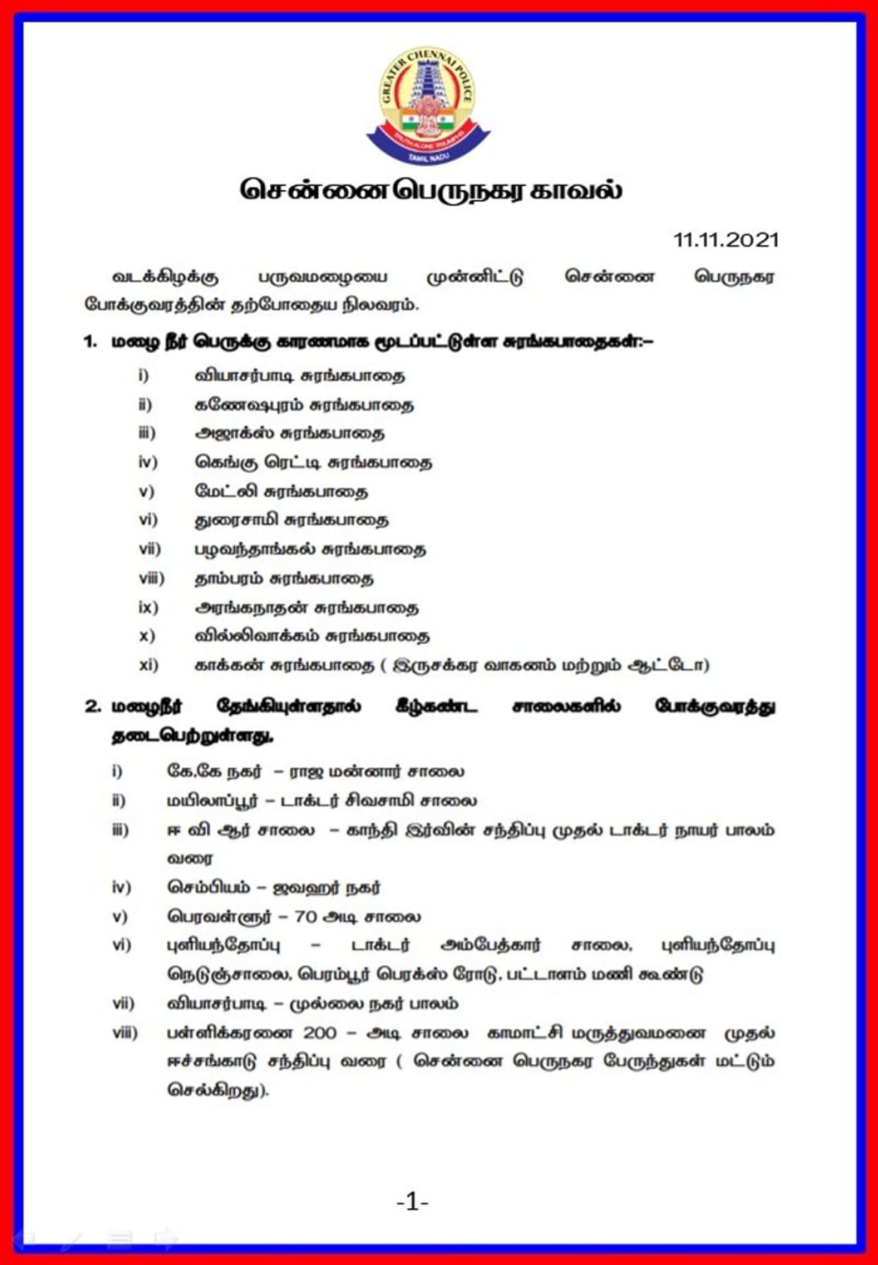 ஆகிய சுரங்கப்பாதைகள் வெள்ள நீர் தேங்கியுள்ளதால் போக்குவரத்திற்கு மூடப்பட்டுள்ளதாக அறிவிக்கப்படுள்ளது.