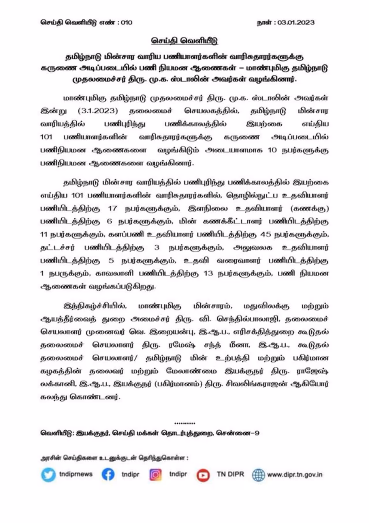தமிழ்நாடு அரசு இன்று வெளியிட்டுள்ள அறிக்கையில், ‘மாண்புமிகு தமிழ்நாடு முதல்வர் மு.க. ஸ்டாலின் இன்று (3.1.2023) தலைமைச் செயலகத்தில், தமிழ்நாடு மின்சார வாரியத்தில் பணிபுரிந்து பணிக்காலத்தில் இயற்கை எய்திய 101 பணியாளர்களின் வாரிசுதாரர்களுக்கு கருணை அடிப்படையில் பணிநியமன ஆணைகளை வழங்கிடும் அடையாளமாக 10 நபர்களுக்கு பணிநியமன ஆணைகளை வழங்கினார்.