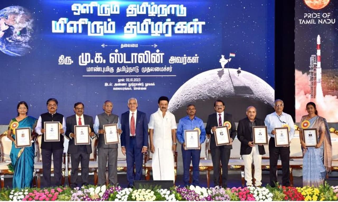 உயர்கல்வித் துறை சார்பில் நடைபெறும் “ஒளிரும் தமிழ்நாடு - மிளிரும் தமிழர்கள் “ சாதனை படைத்த தமிழ்நாட்டு விண்வெளி விஞ்ஞானிகளுக்கான பாராட்டு விழா சென்னை, கோட்டூர்புரம், அண்ணா நூற்றாண்டு நூலக கலையரங்கில் நடைபெற்றது. இந்த விழாவில் இஸ்ரோவில் பணியாற்றி ஓய்வு பெற்ற சிவன், மயில்சாமி அண்ணாதுரை மற்றும் சந்திரயான் திட்ட இயக்குனர் வீர, ஆதித்யா திட்ட இயக்குனர் நிகர்ஷாஜி உள்ளிட்ட விஞ்ஞானிகள் கலந்து கொண்டனர்.