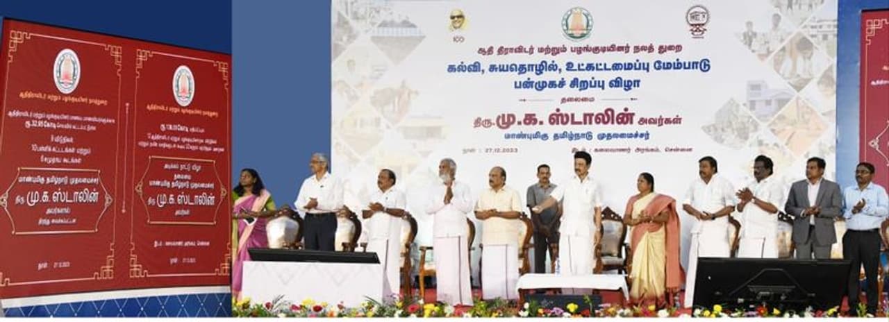 சென்னை கலைவாணர் அரங்கில் முதலமைச்சர் மு.க.ஸ்டாலின், ஆதிதிராவிடர் மற்றும் பழங்குடியினர் நலத்துறை சார்பில் புதிய திட்டப் பணிகளுக்கு அடிக்கல் நாட்டி, ஆதிதிராவிடர் மற்றும் பழங்குடியினர் நலத்துறை குறு, சிறு மற்றும் நடுத்தர தொழில் நிறுவனங்கள் துறை சார்பில் 184 கோடி மதிப்பிலான நலத்திட்ட உதவிகளை முதலமைச்சர் வழங்கினார்.