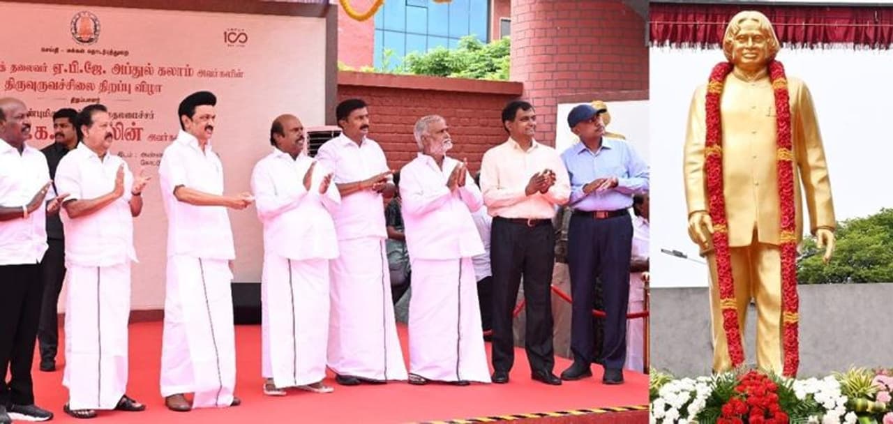 இதனிடையே டாக்டர் ஏ.பி.ஜெ. அப்துல் கலாம் அவர்களுக்கு சிறப்பு சேர்க்கும் வகையில், சென்னை, கிண்டி, அண்ணா பல்கலைக்கழக வளாகத்தில் ஏ.பி.ஜெ. அப்துல் கலாமுக்கு புதிதாக சிலை அமைக்க சிலை அமைக்க முடிவு செய்யப்பட்டது. இதனையடுத்து அந்த பணிகளை முடிவடைந்ததனையடுத்து இன்று அப்துல்கலாமின் பிறந்தநாளையொட்டி புதிதாக நிறுவப்பட்டுள்ள முன்னாள் குடியரசுத் தலைவர் டாக்டர் ஏ.பி.ஜெ. அப்துல் கலாம் அவர்களின் திருவுருவச் சிலையை தமிழ்நாடு முதலமைச்சர் ஸ்டாலின் திறந்து வைத்தார்.