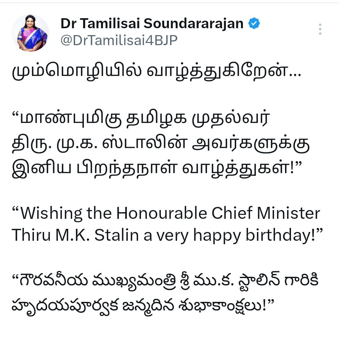 பா.ஜ.க. நிர்வாகியான அன்பு சகோதரி டாக்டர் தமிழிசை சௌந்திரராஜன் அவர்கள் எனக்கு ‘மும்மொழி’யில் வாழ்த்துத் தெரிவித்துப் பதிவிட்டிருந்தார். மும்மொழித் திட்டத்தை ஏன் எதிர்க்கிறோம் என்பதை விளக்கி என்னுடைய பிறந்தநாள் செய்தியை நான் வெளியிட்டிருந்த நிலையில், சகோதரி அவர்கள் மும்மொழியில் வாழ்த்தி தன் அன்பையும், தன் இயக்கத்திற்குரிய ‘பண்பையும்’ காட்டியிருக்கிறார்.
