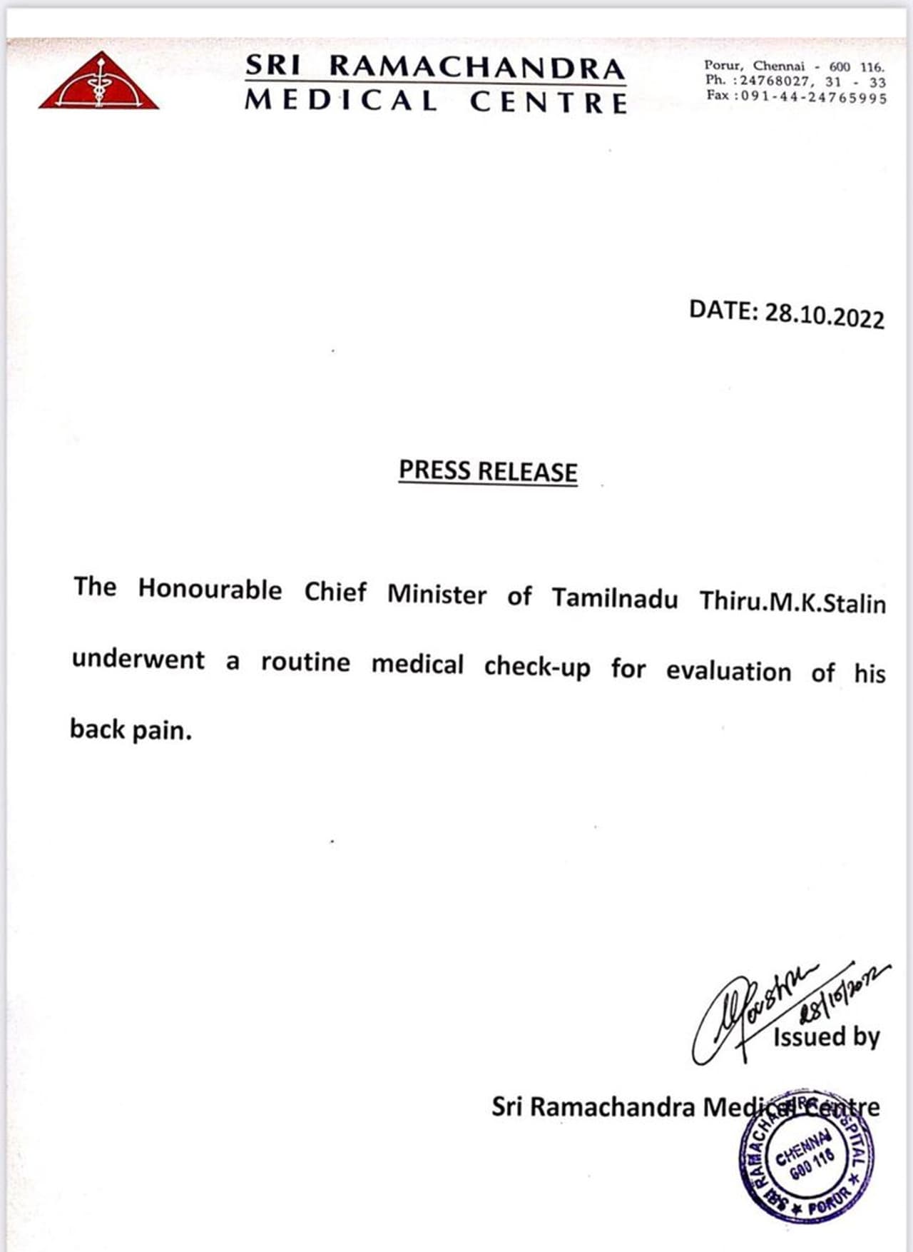 இந்த நிலையில் முதல்வர் மு.க.ஸ்டாலின் உடல்நிலை குறித்து மருத்துவமனை வெளியிட்டுள்ள அறிக்கையில், முதல்வர் மு.க.ஸ்டாலின் அவருடைய முதுகுவலி தொடர்பாக வழக்கமாக மேற்கொள்ளப்படும் மருத்துவ பரிசோதனைக்காக மருத்துவமனைக்கு வந்ததாக தெரிவிக்கப்பட்டுள்ளது. இதனிடையே முதல்வர் மு.க.ஸ்டாலின் போரூர் மருத்துவமனைக்கு சென்றதை அடுத்து அங்கு ஏராளமான போலீஸார் பாதுகாப்பு பணியில் ஈடுபட்டனர் என்பது குறிப்பிடத்தக்கது.
